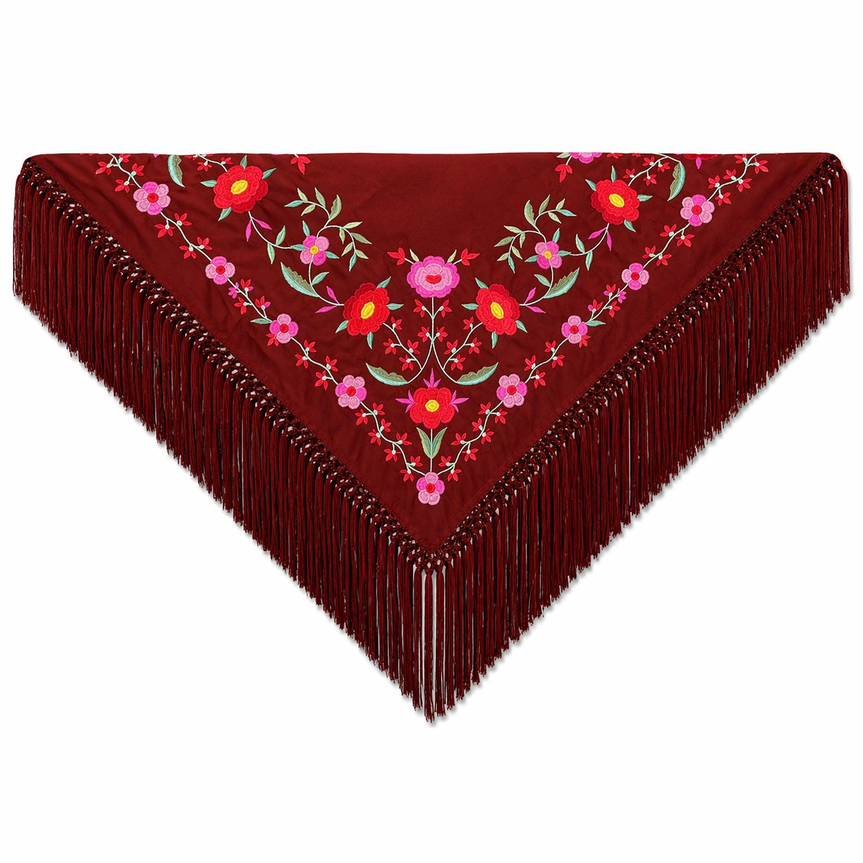 El alma de la fiesta en tus hombros: Mantoncillo burdeos bordado en rosa