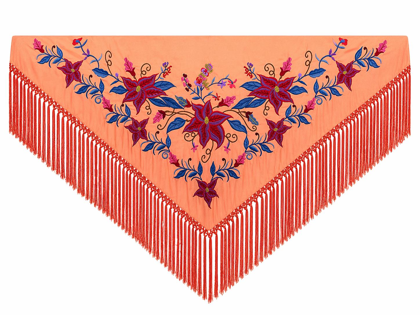 El latido de la Feria: tu mantoncillo Flor Imperial Coral con bordado Azulón