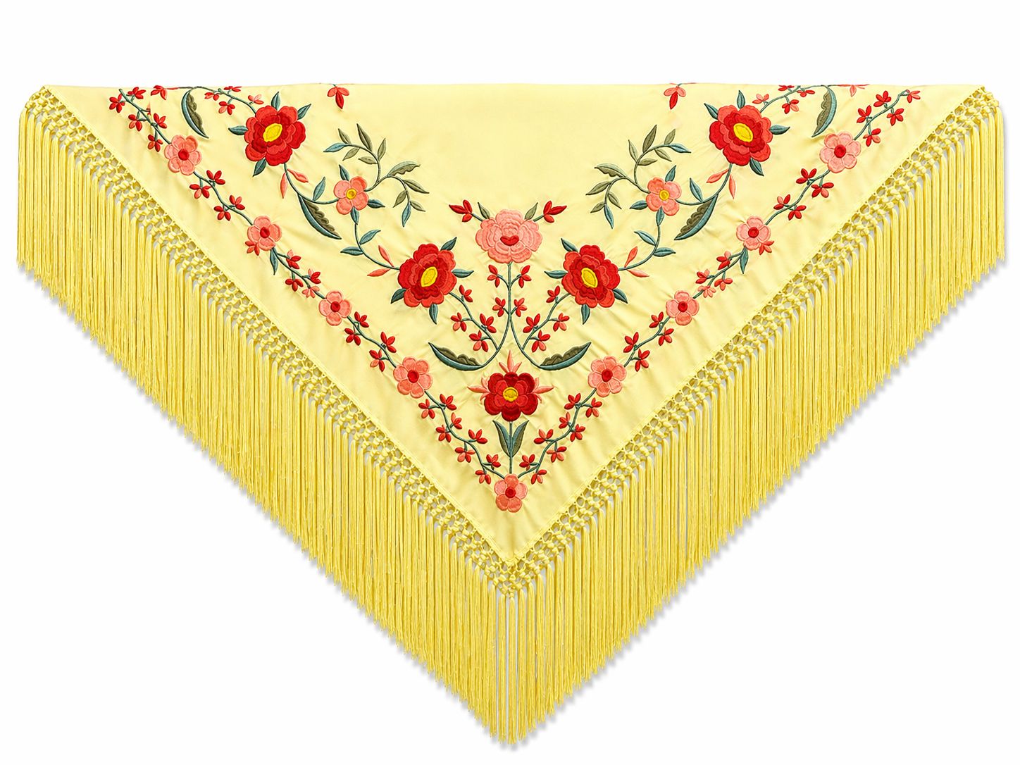 Siente cómo la seda acaricia tu piel, ligera pero con la presencia justa para acompañar cada uno de tus movimientos. Sus amarillos vibrantes se encienden bajo los farolillos, prometiendo una noche inolvidable, mientras los bordados florales en tonos coral celebran la vida con la misma intensidad que late en cada corazón rociero. En una romería, ya sea en El Rocío o en cualquier rincón de Andalucía que honre sus tradiciones, este mantoncillo te conecta con la tierra, con el camino y con esa hermandad que se siente en cada paso.