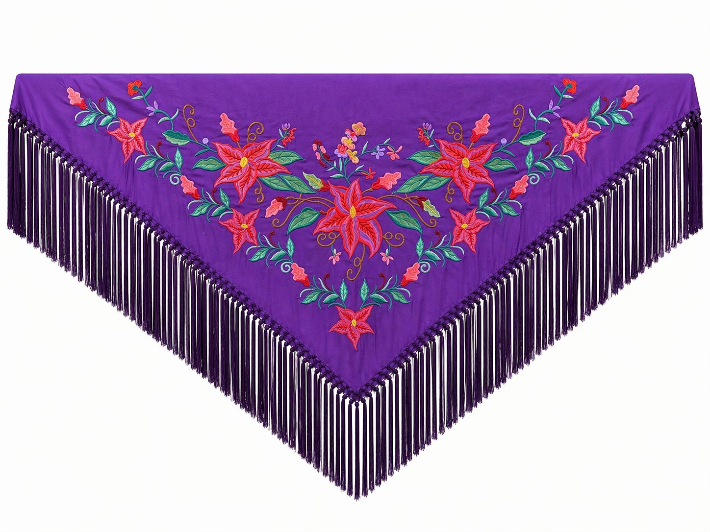 Al posarse sobre tus hombros, sentirás el peso justo de su tejido de primera calidad, una caricia que te envuelve mientras cruzas las calles de albero. Cada movimiento, cada giro para saludar, se verá acompañado por el baile armónico de sus flecos morados, un contrapunto perfecto al corazón de la fiesta. Su color morado, profundo y misterioso, transmite una elegancia arraigada y una seguridad que florece bajo la luz del día y se intensifica con el brillo de las noches de verbena. Es la expresión de tu esencia flamenca, una pieza diseñada para contar tu historia en cada paso y cada mirada.
