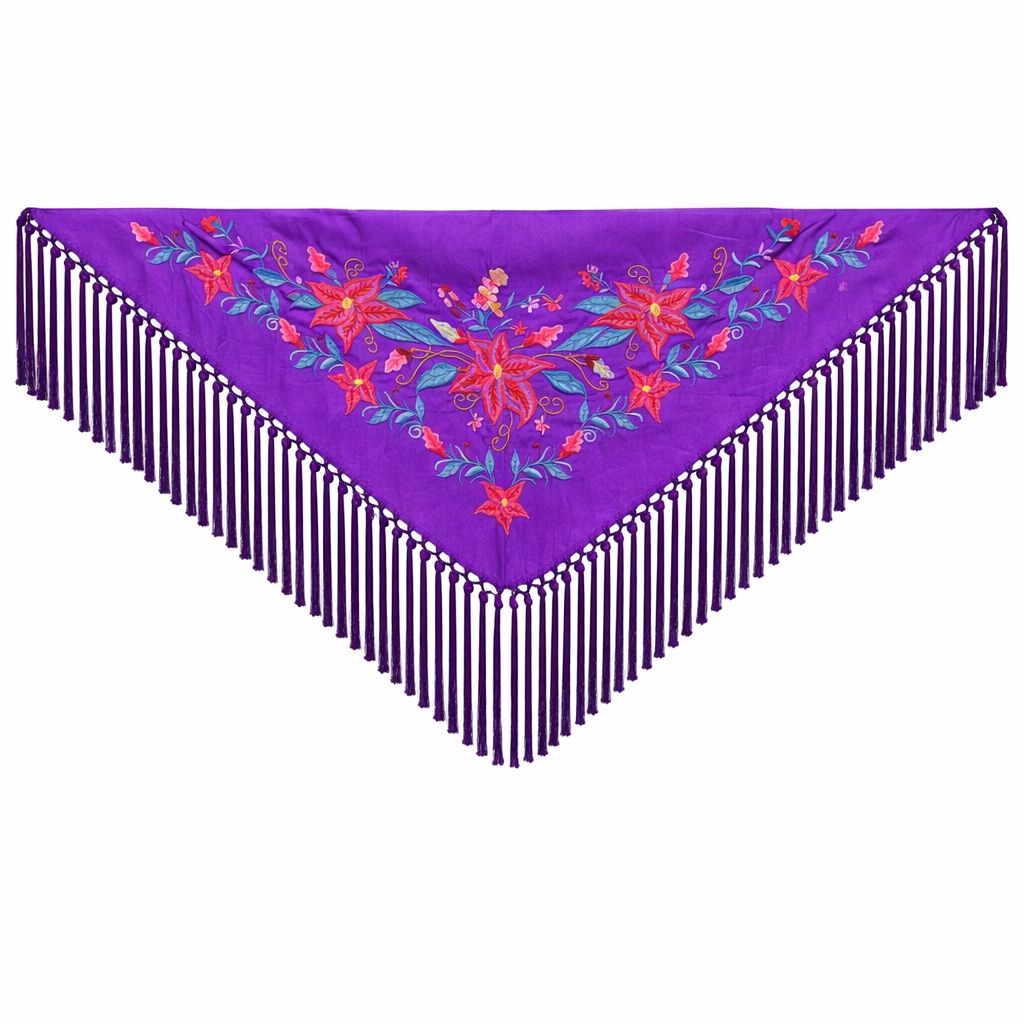 ¿Con qué colores de traje combina mejor este mantoncillo? El morado nazareno es una base sofisticada que contrasta a la perfección con el rojo y turquesa de su bordado. Armoniza de maravilla con trajes en tonalidades neutras como cremas, beis o negros, así como con verdes botellas o azules noche, y resalta sobre los lunares más atrevidos. Es una pieza camaleónica que te permitirá jugar con múltiples estilismos.