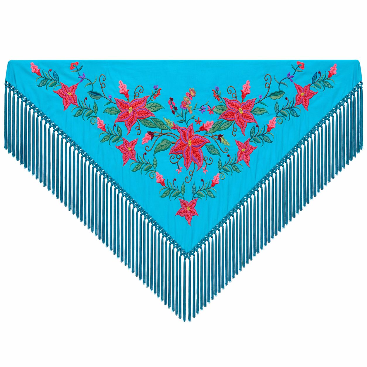¿Con qué colores de traje flamenca combina mejor este turquesa? El turquesa verde de base, con su bordado en rojos, rosas, verdes y toques de violeta, naranja y amarillo, es sorprendentemente versátil. Combinará de maravilla con trajes en tonos crudos, beige, blanco y neutros, permitiendo que el mantoncillo sea el protagonista. También con verdes más oscuros, azules marinos, o incluso con rojos y corales si buscas un contraste vibrante y atrevido. Perfecto para lunares y lisos.