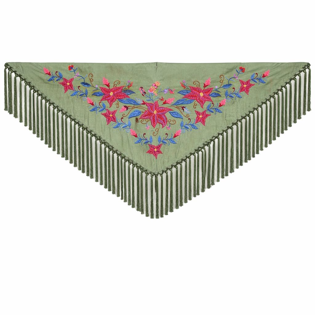¿Con qué colores de traje combina mejor este mantoncillo? Su tono verde jabonoso, combinado con el bordado en rojo intenso y añil, crea una armonía perfecta con trajes en tonos crema, coral, blanco roto, negros o incluso estampados de lunares que integren estos colores. Es una pieza versátil que aporta un toque de frescura y distinción a cualquier estilismo de feria.