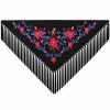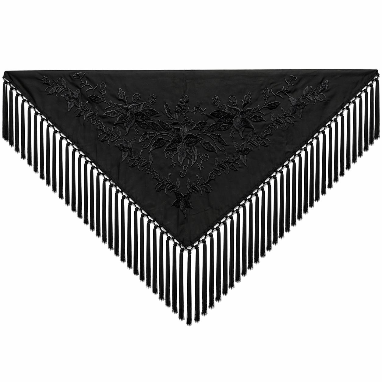 - Cada detalle está cuidado al milímetro: los diseños propios que se bordan sobre la seda de primera calidad son fruto de semanas de dedicación, y el enflecado a mano convierte cada mantón en una joya única. No vas a encontrar dos iguales; la sutileza del bordado tono sobre tono en negro sobre negro crea un efecto visual de relieve y textura que impacta sin estridencias, haciendo que esta pieza sea tan sofisticada como versátil.