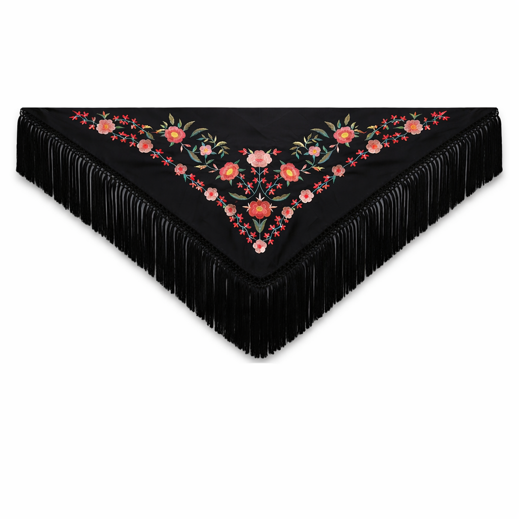 Imagina la primera brisa de la tarde en el Real, el perfume a jazmín y albero mojado, y un rumor de palmas que te llama. Tu entrada al Real, con el sol cayendo y los farolillos encendiéndose, es más que un paseo: es una declaración. Con nuestro Mantoncillo flamenco negro bordado coral, cada paso es una sevillana callada, cada giro, un suspiro de elegancia. Con este mantoncillo no solo vistes, conquistas.