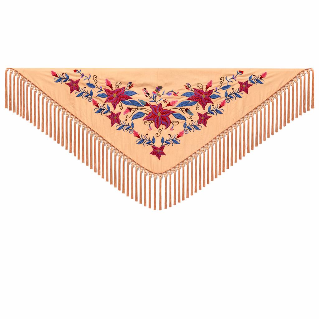 ¿Cómo cuidarlo para que te acompañe en muchas ferias? Para conservar su belleza, guárdalo extendido o cuidadosamente doblado, evitando que los flecos se enreden. Para desenredarlos suavemente, utiliza un peine de púas anchas. Recomendamos la limpieza en tintorería especializada para mantener la calidad de la seda y el bordado.