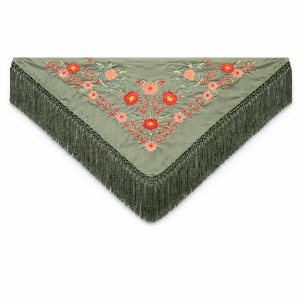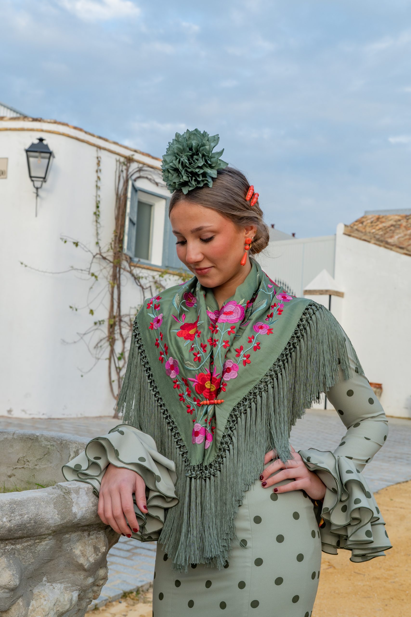 - Cada puntada es arte sevillano: elaborado artesanalmente en Sevilla, cada bordado floral en tonos coral sobre la seda verde oliva es fruto de un diseño propio y un trabajo minucioso. El enrejado, hecho a mano, garantiza unos flecos que se moverán con gracia en cada uno de tus gestos.