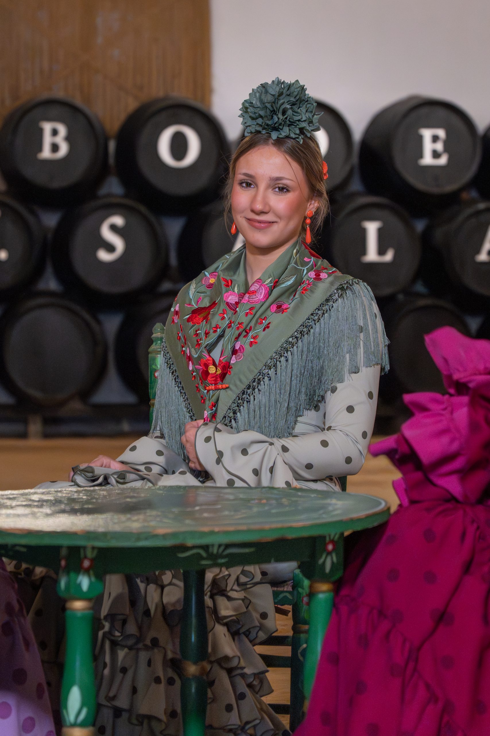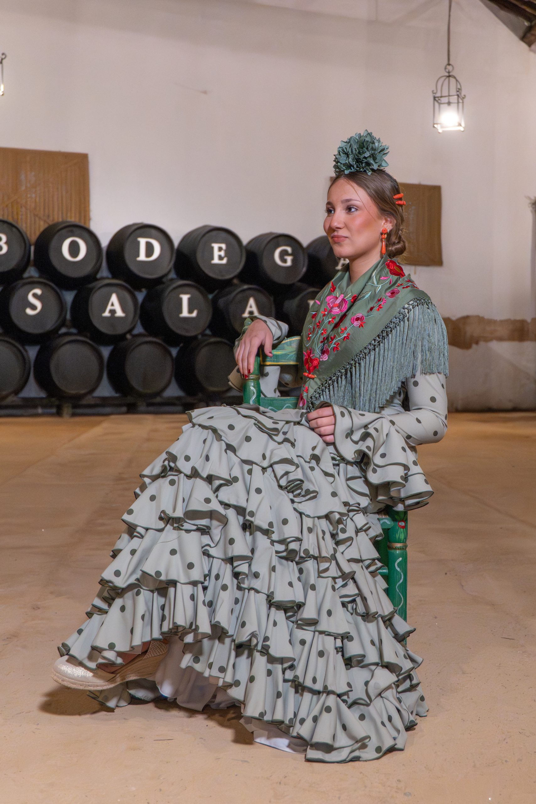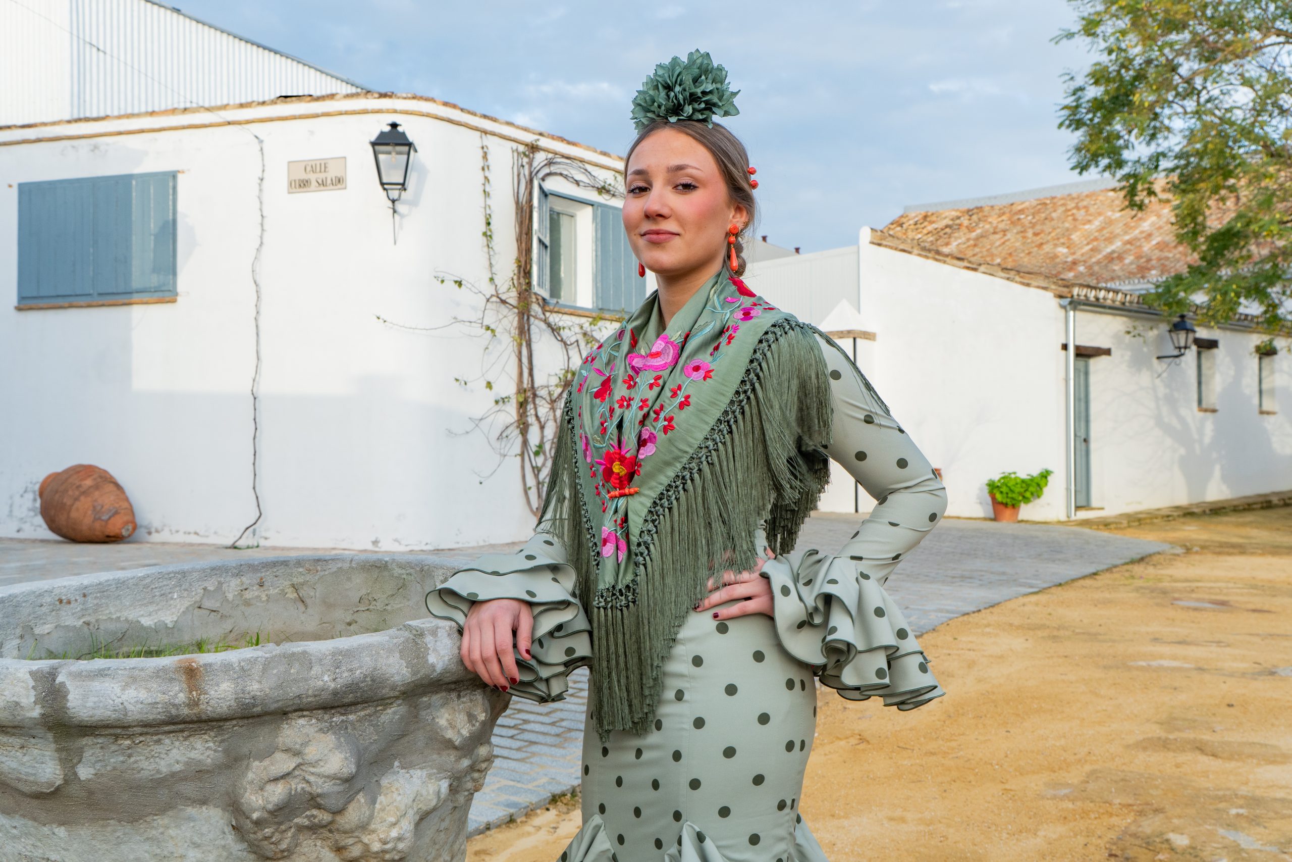 El verde oliva es un tono muy favorecedor que combina excepcionalmente bien con una amplia gama de colores. Armoniza de maravilla con trajes en tonos neutros como el beige, crudo, negro o blanco, generando un contraste elegante. También resalta con la calidez del coral en estampados y lunares, así como con la intensidad de rojos, naranjas quemados o marrones, creando combinaciones vibrantes y muy flamencas.