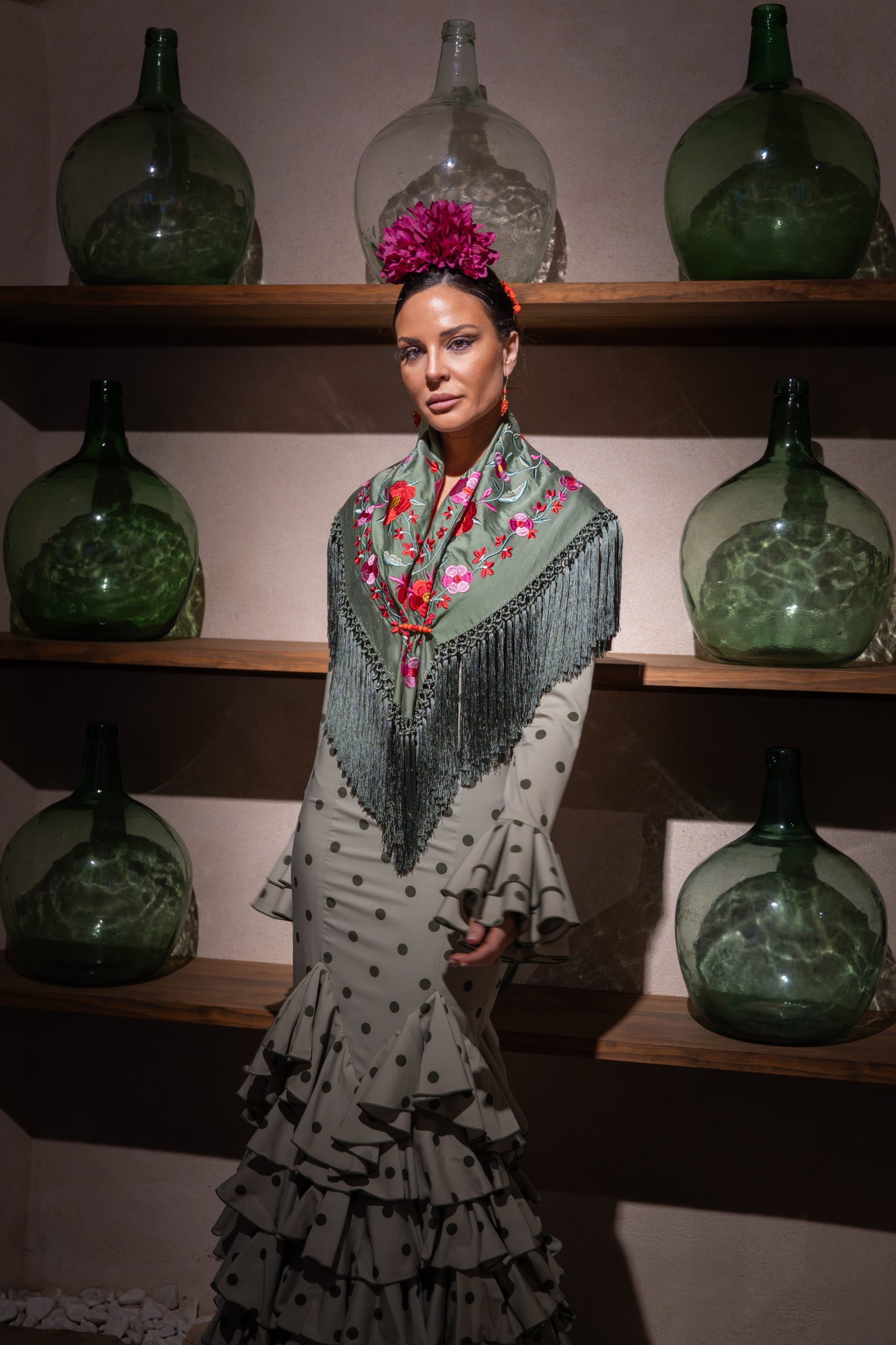 Imagínate justo en la entrada del Real, al atardecer, cuando los farolillos empiezan a encenderse uno a uno. El suave murmullo de la gente, el aroma a jazmín y albero mojado. Tu mantoncillo, un manto de seda verde oliva bordado con la pasión del coral, es el preludio perfecto para una noche flamenca inolvidable.