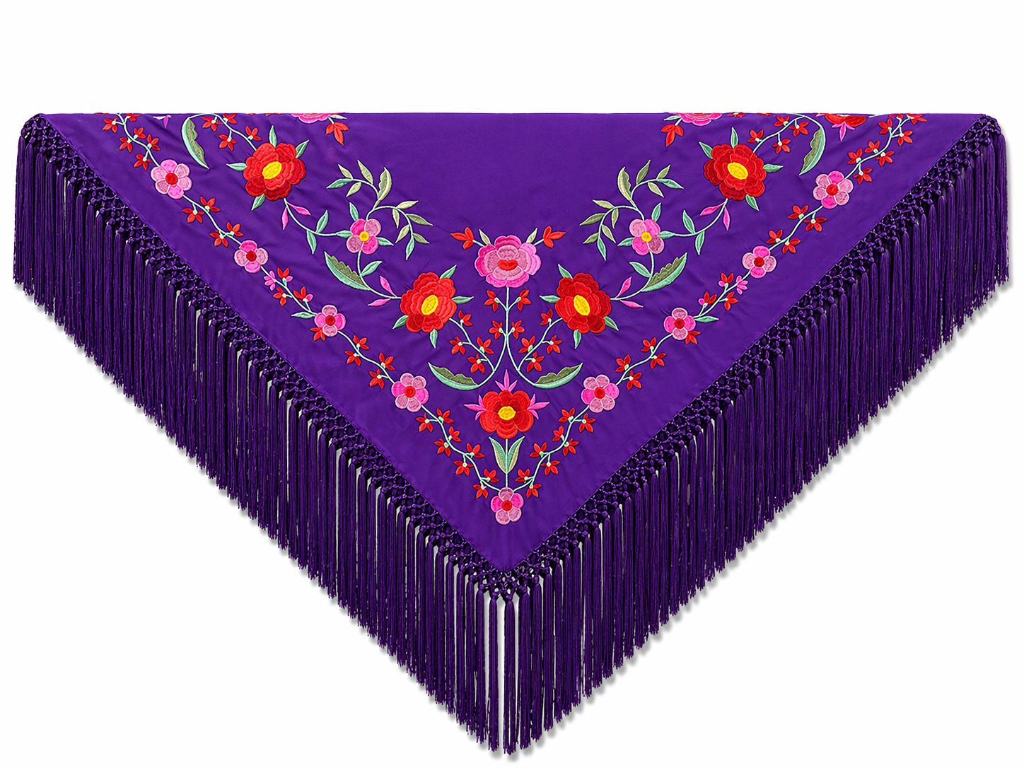 Este mantoncillo es puro sentir. Su majestuoso color violeta nazareno, intenso y profundo, abraza tus hombros con la promesa de una noche mágica. Al caer el sol sobre el albero, los bordados florales en rojo, fucsia y verde cobran vida, bailando con cada cante y cada giro. Sientes cómo el ligero peso de sus flecos de borlón se mueve contigo, dibujando una silueta de pura gracia y empaque. No es solo un complemento, es una declaración, un poema visual que habla de tu esencia andaluza, de tu alegría serena y de esa fuerza que te impulsa a vivir cada feria y romería con el corazón abierto.