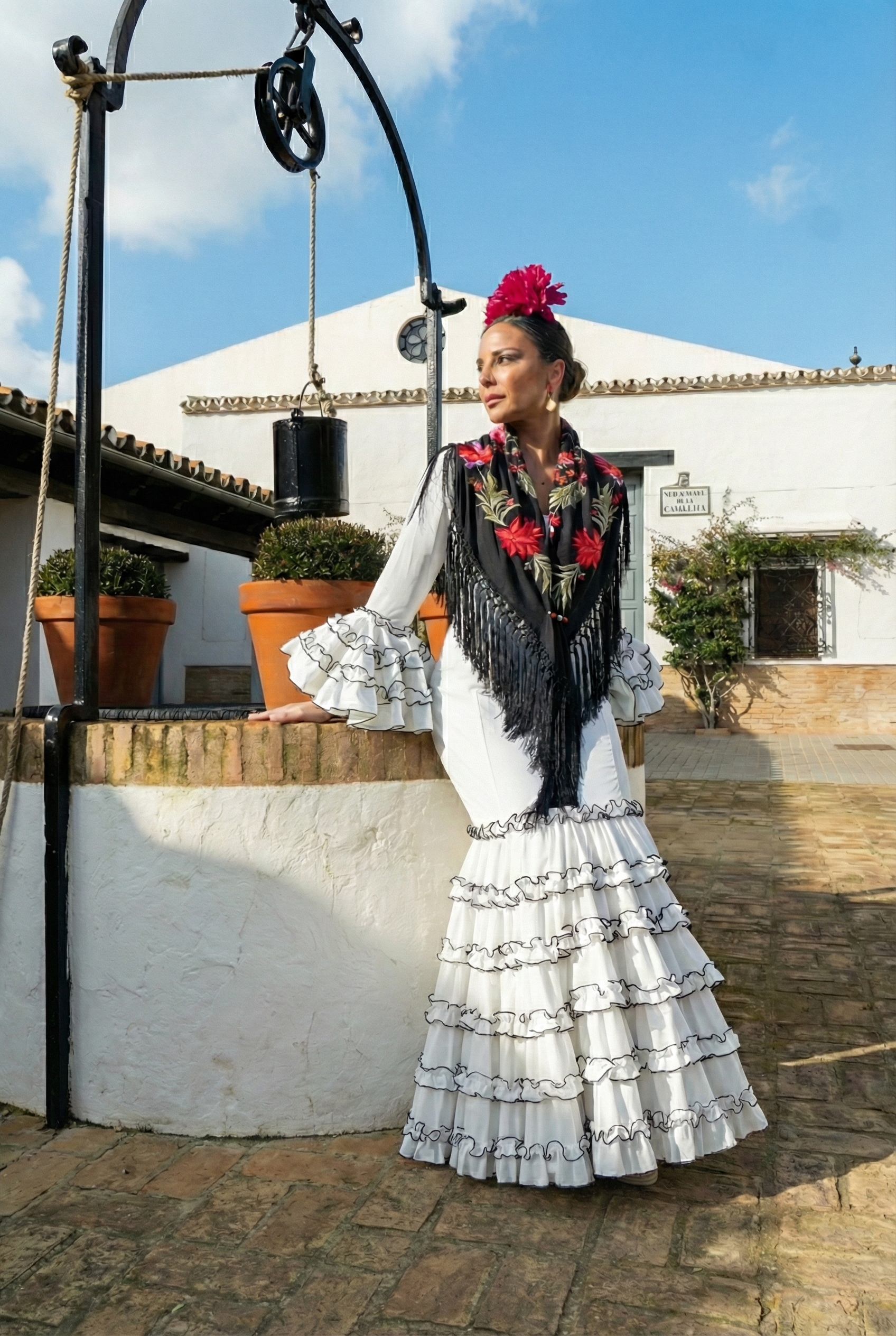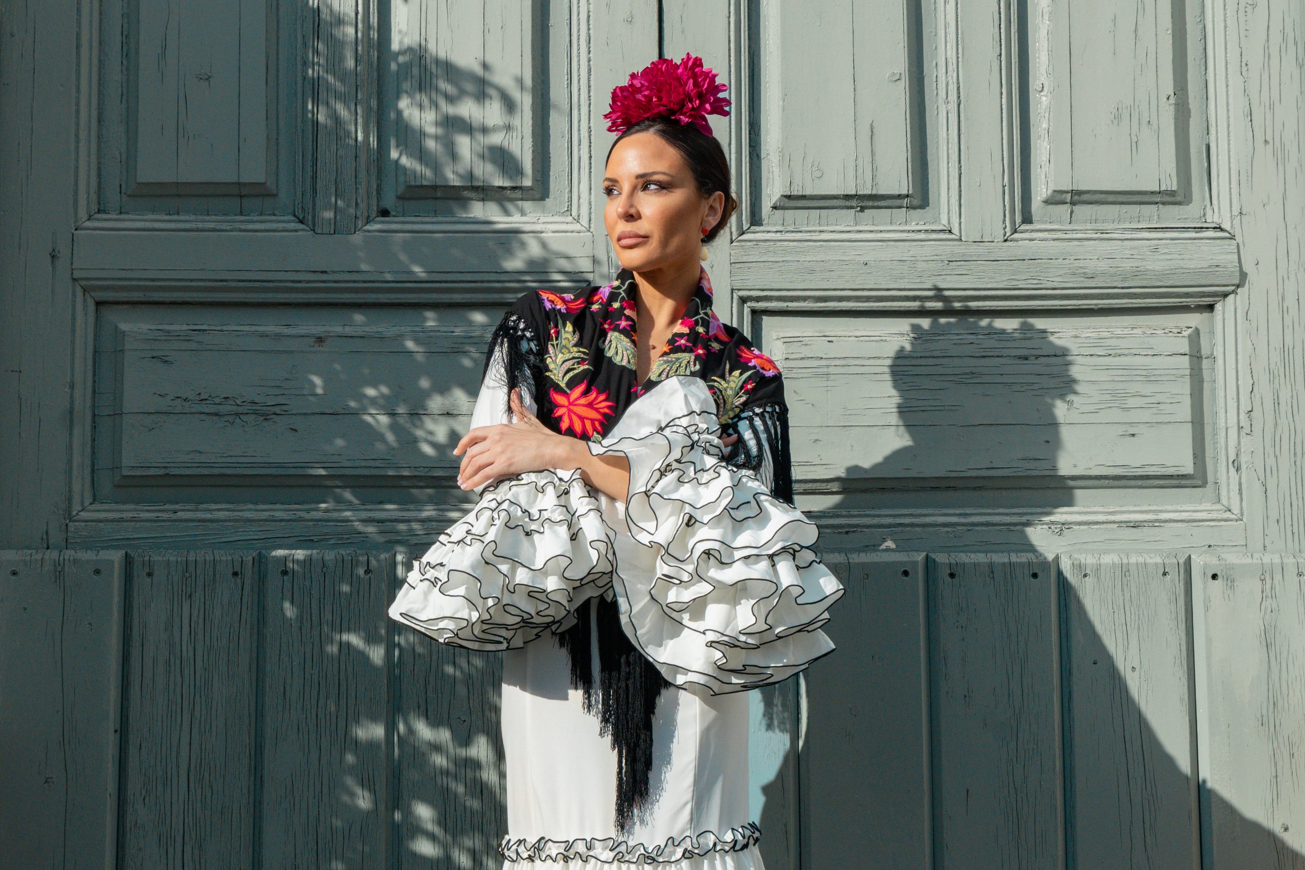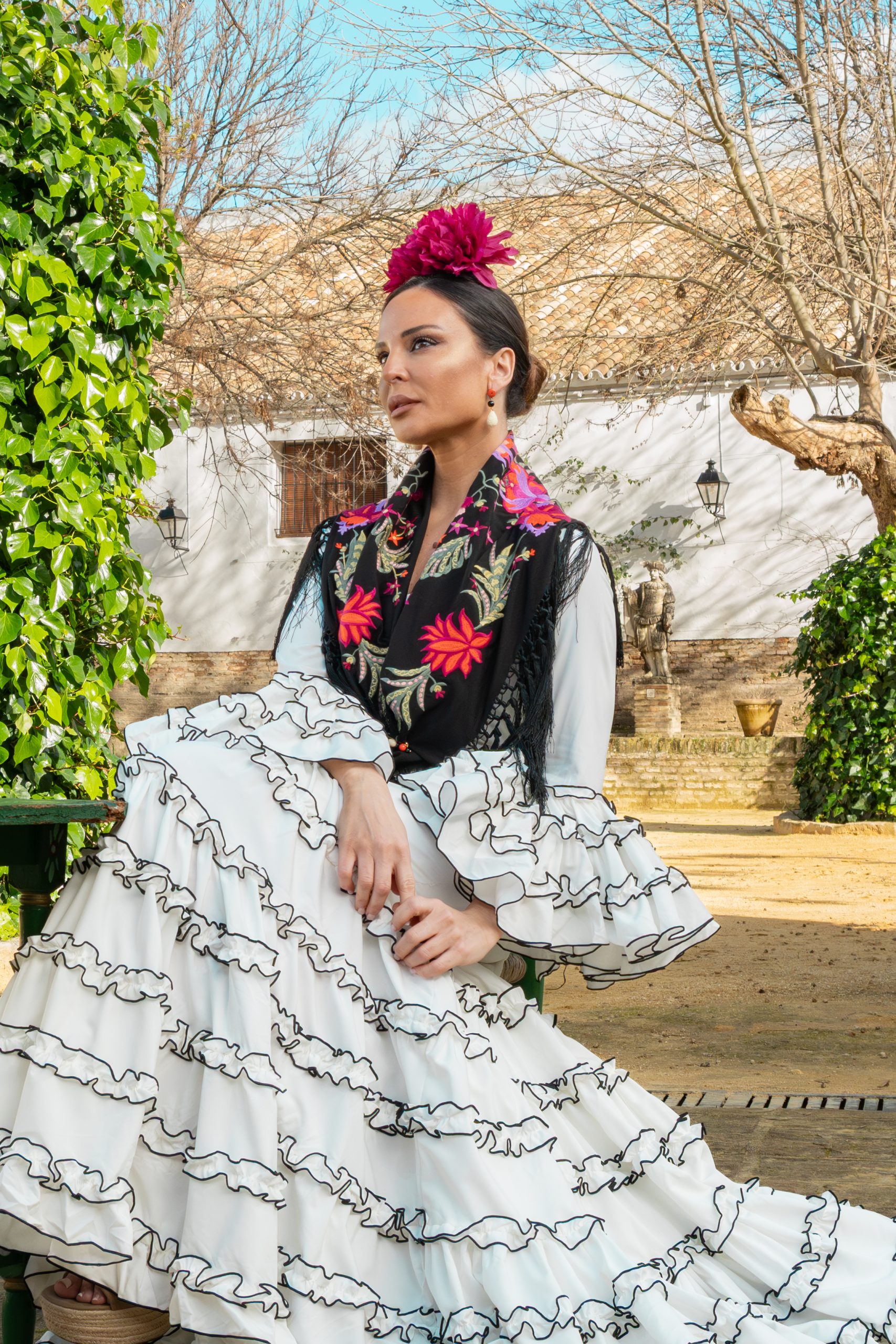 El blanco puro permite jugar con complementos de color o neutros: desde mantoncillos bordados hasta pendientes dorados o coral, creando un look único con personalidad propia.