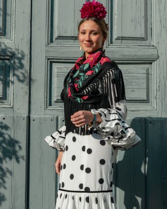 Su corte entallado hasta la cadera realza la figura y la falda de volantes canasteros amplios aporta movimiento, elegancia y presencia. El contraste blanco y negro transmite fuerza, sofisticación y seguridad, siendo siempre una apuesta acertada para mujeres que buscan un traje flamenco elegante y atemporal.