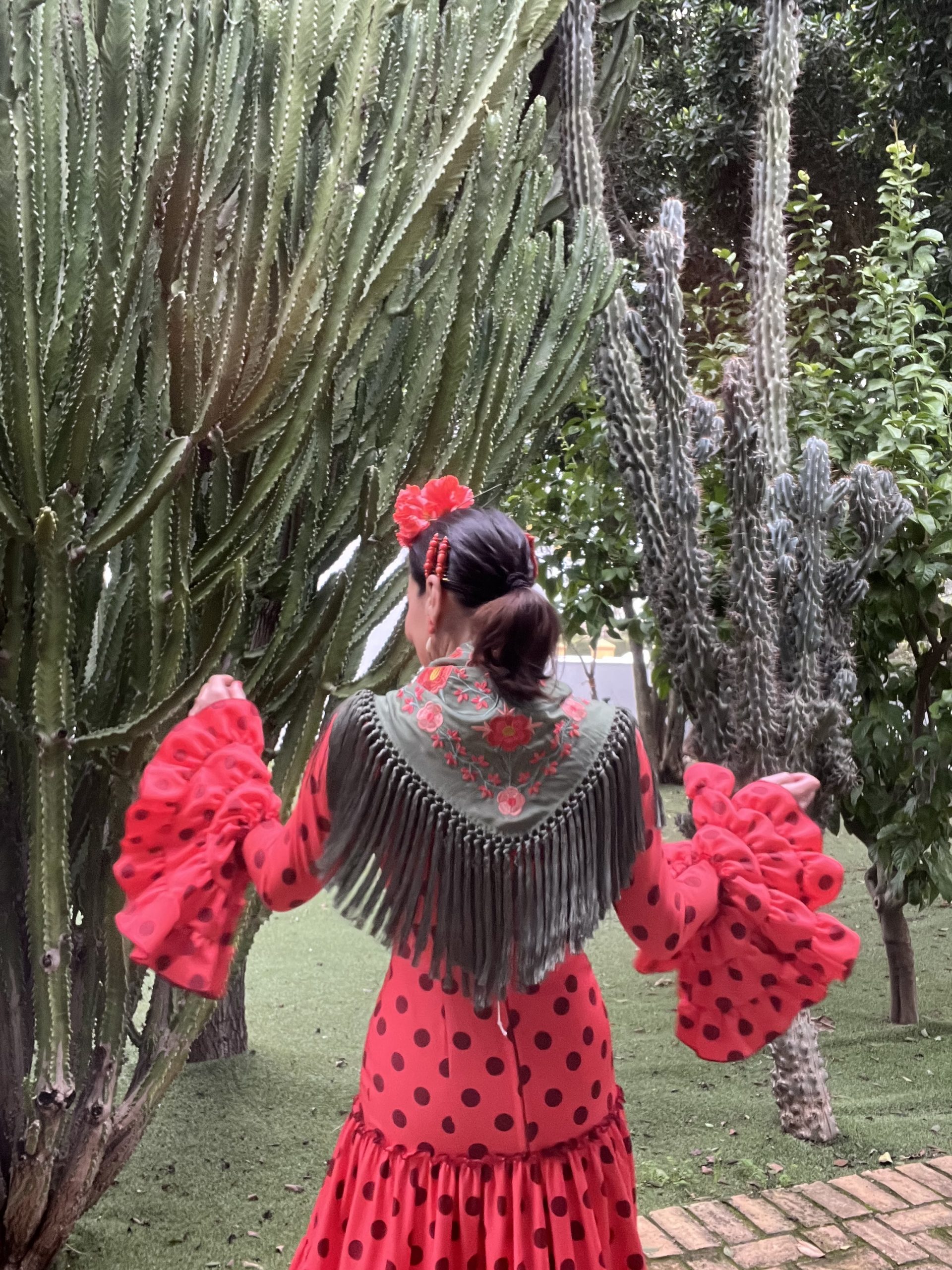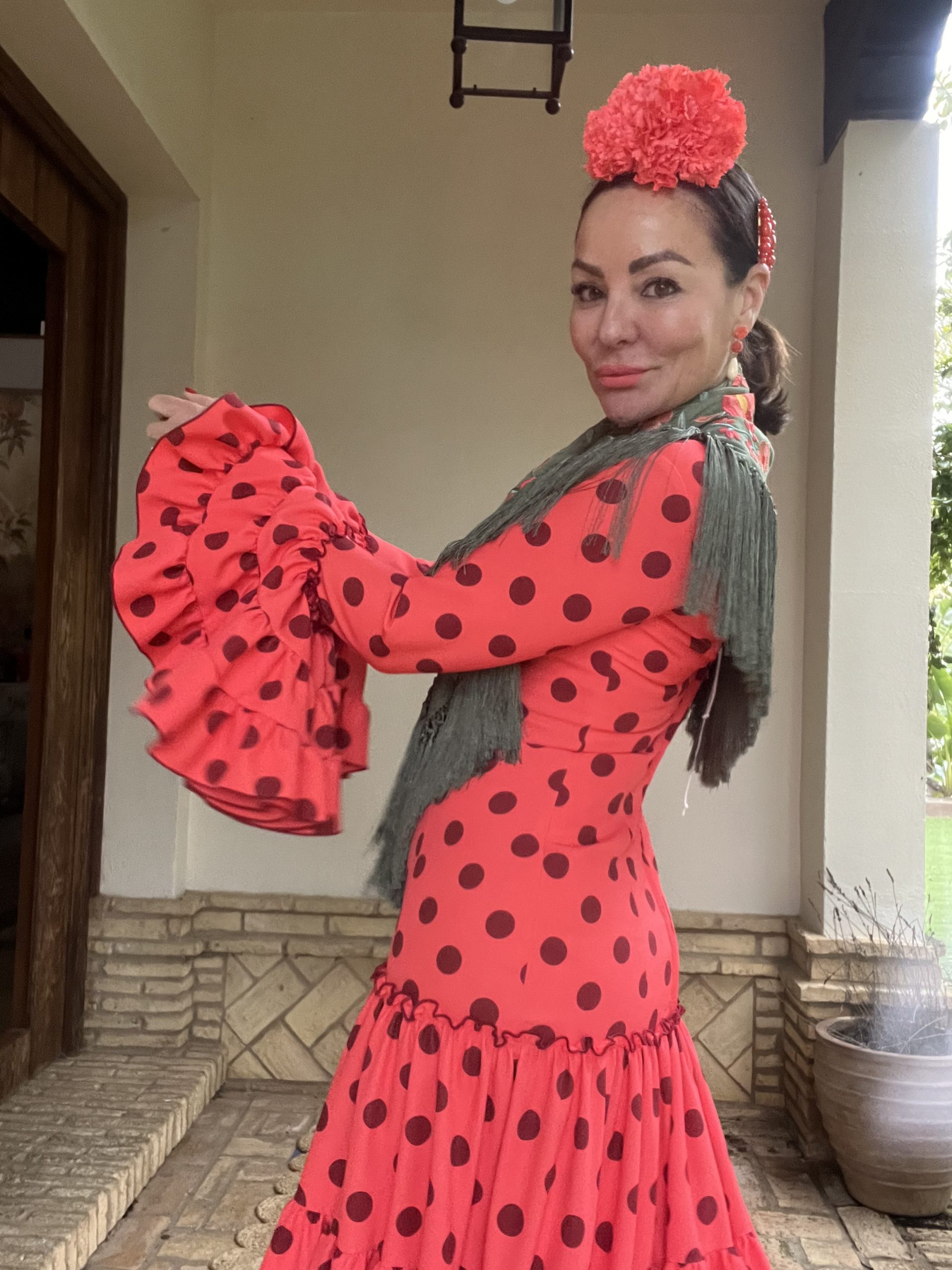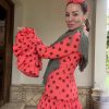 Traje de flamenca canastero de talle alto, fabricado en Sevilla, diseñado para adaptarse al cuerpo como un guante y favorecer a todas las mujeres. Su tejido bielástico proporciona un ajuste cómodo y estilizado, realzando la figura de forma natural.