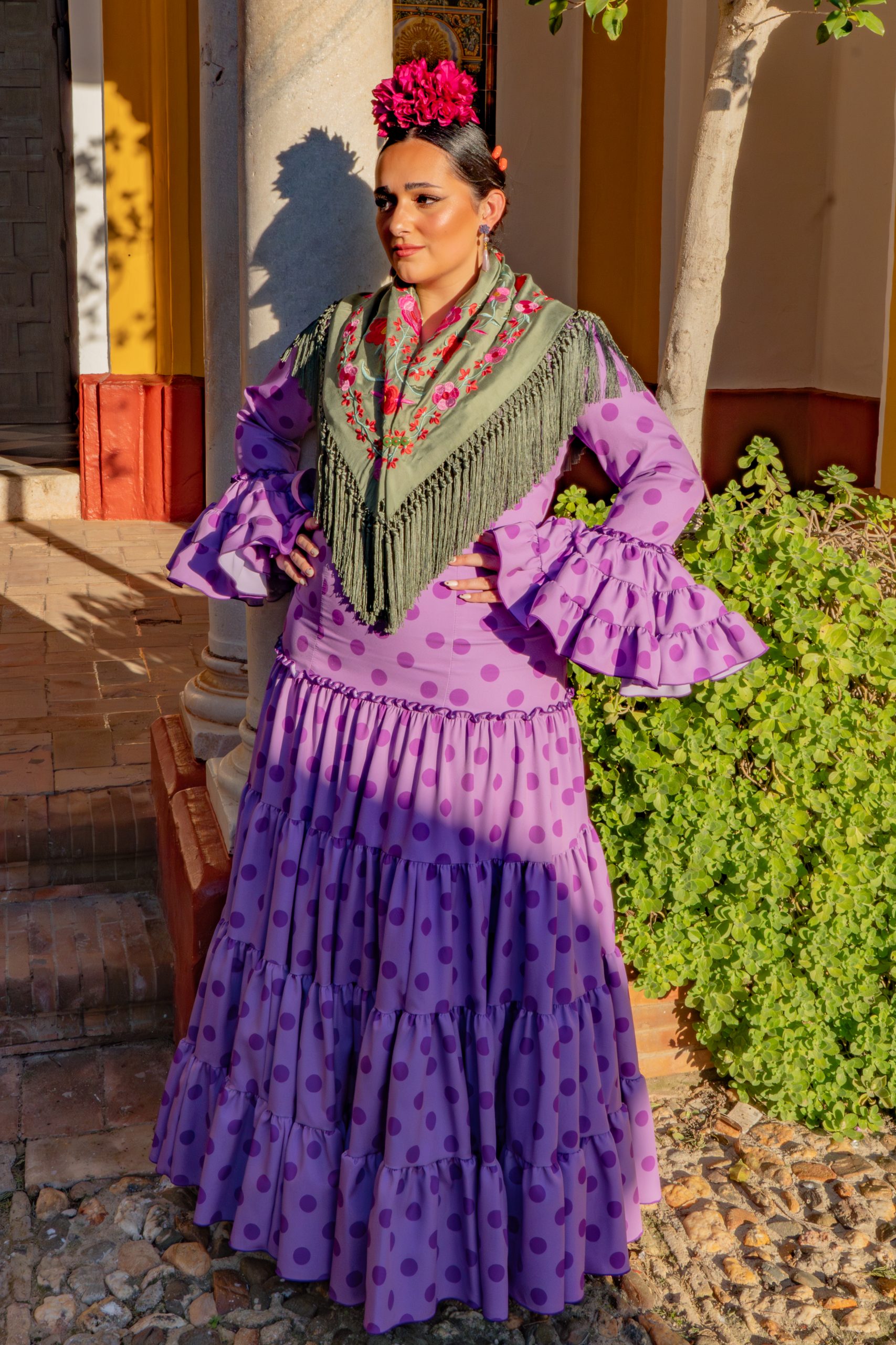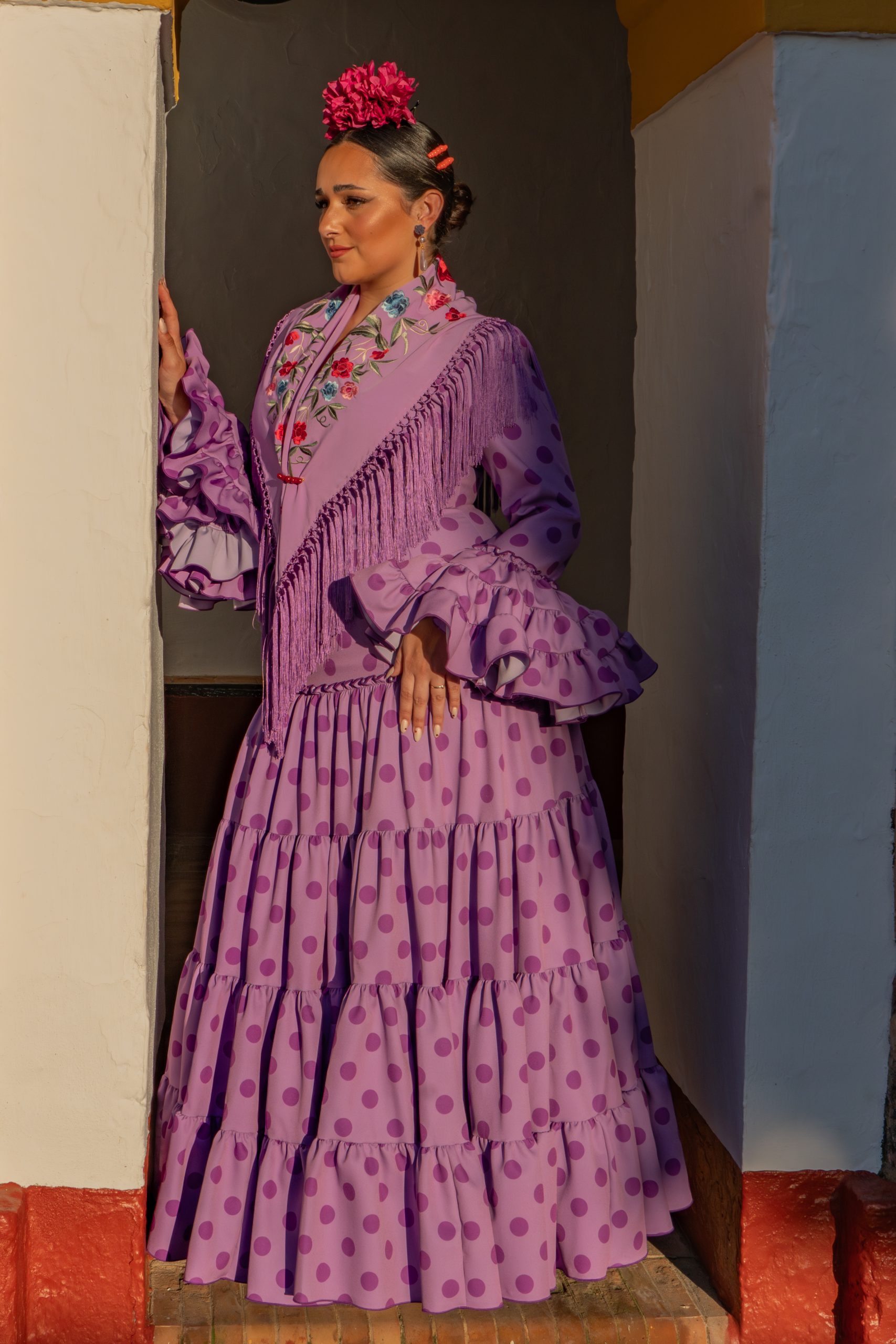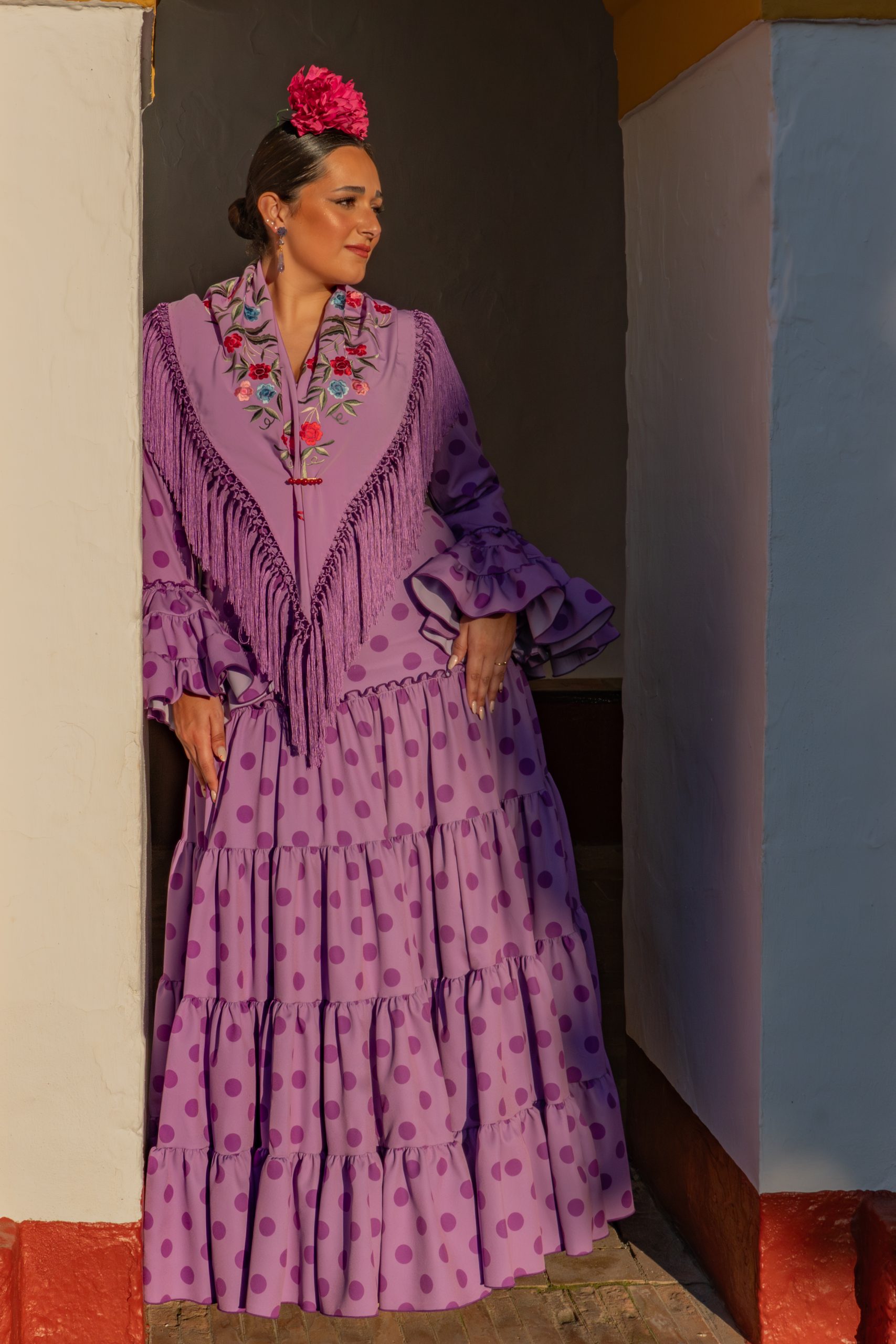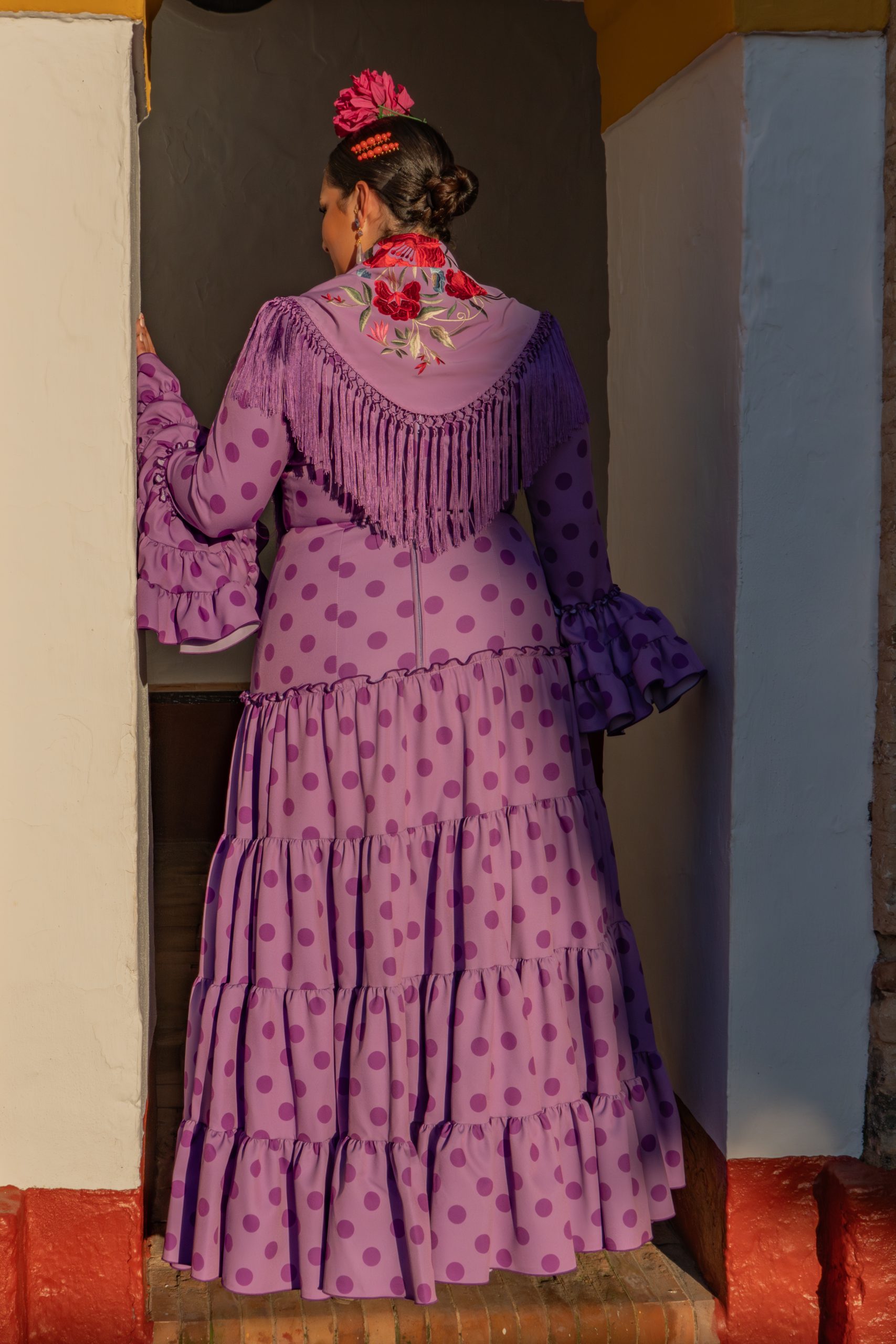 Cayetana Lila. Este tono lavanda es pura tendencia y aporta una suavidad angelical a tu look flamenco. Fabricado artesanalmente en Sevilla, este traje cuenta con nuestro patrón especial para tallas grandes que realza el pecho у suaviza la cadera, permitiéndote ser la flamenca más elegante y actual de la caseta.”