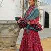Es el traje estrella para las ferias de día y las tardes de paseo de caballos. El contraste del rojo y el aguamarina bajo la luz del sol de Sevilla crea un efecto vibrante que resalta de forma espectacular en las fotografías y vídeos.