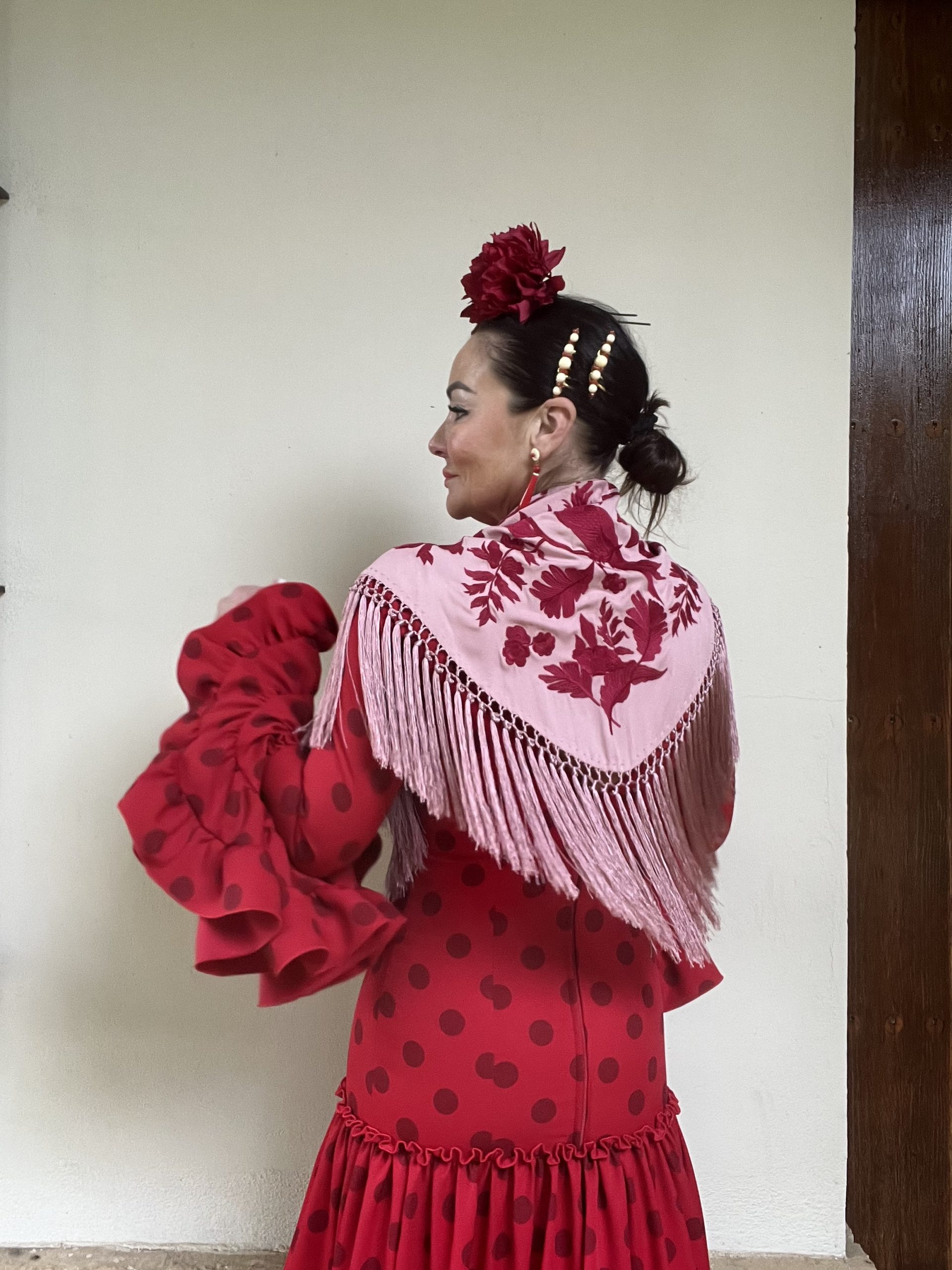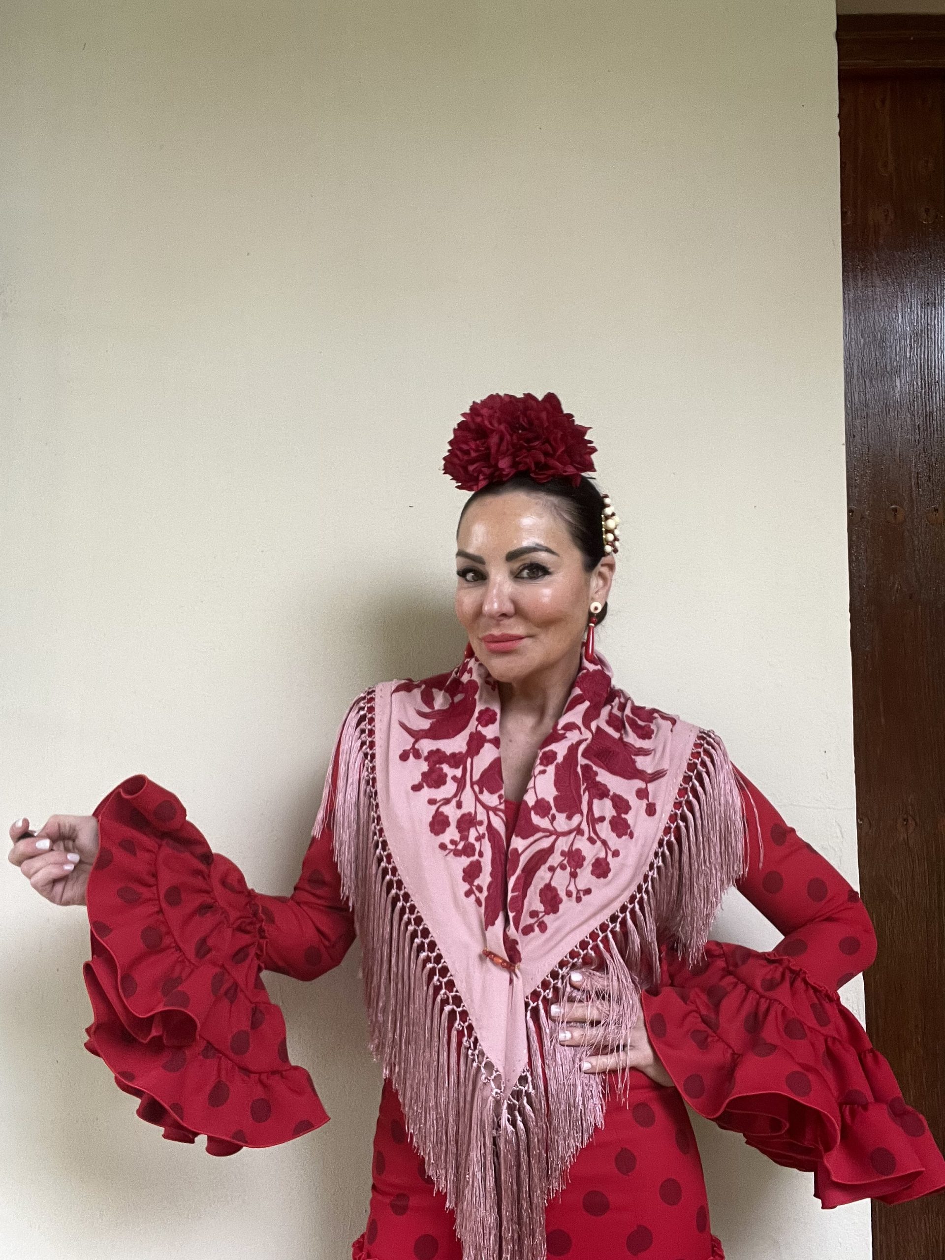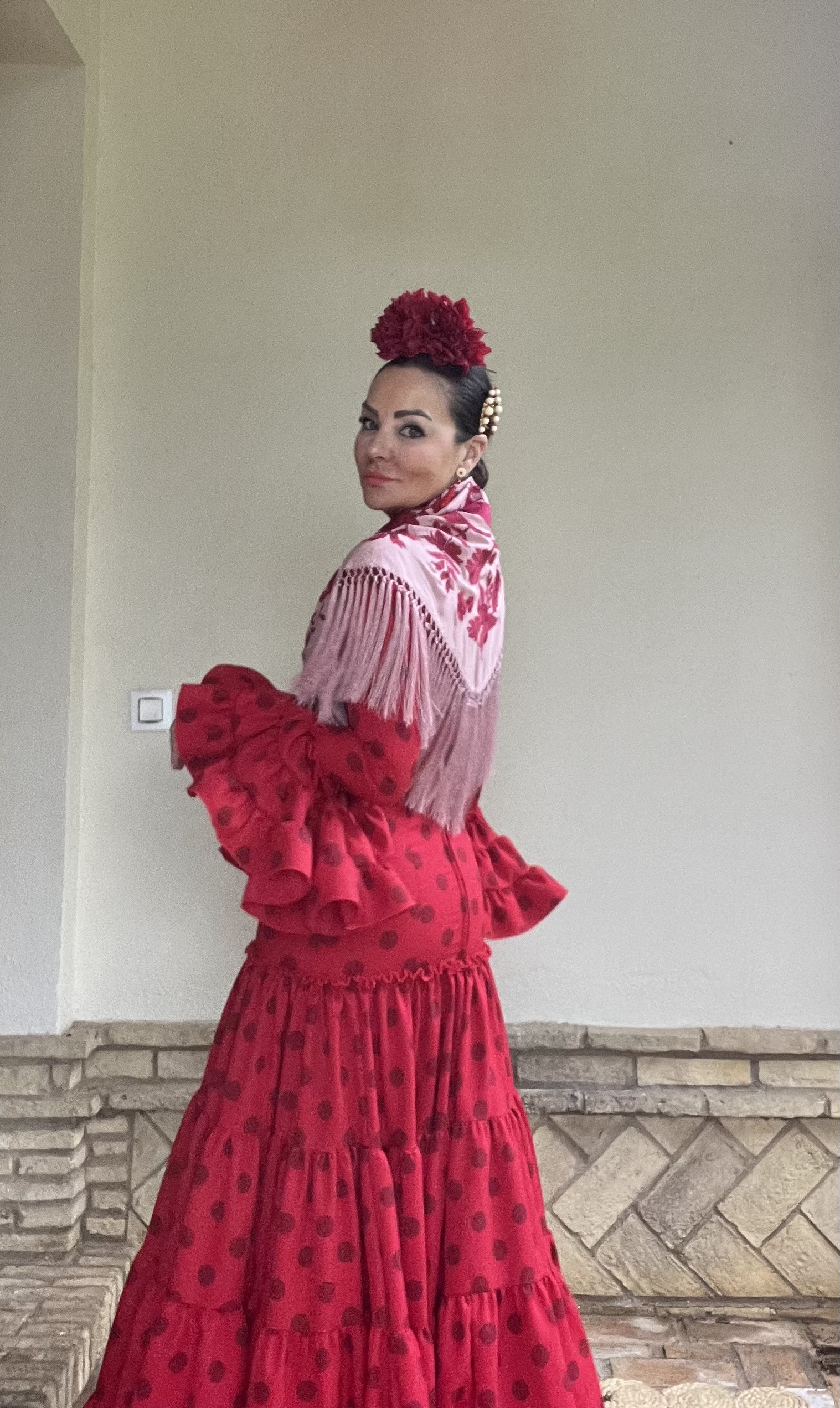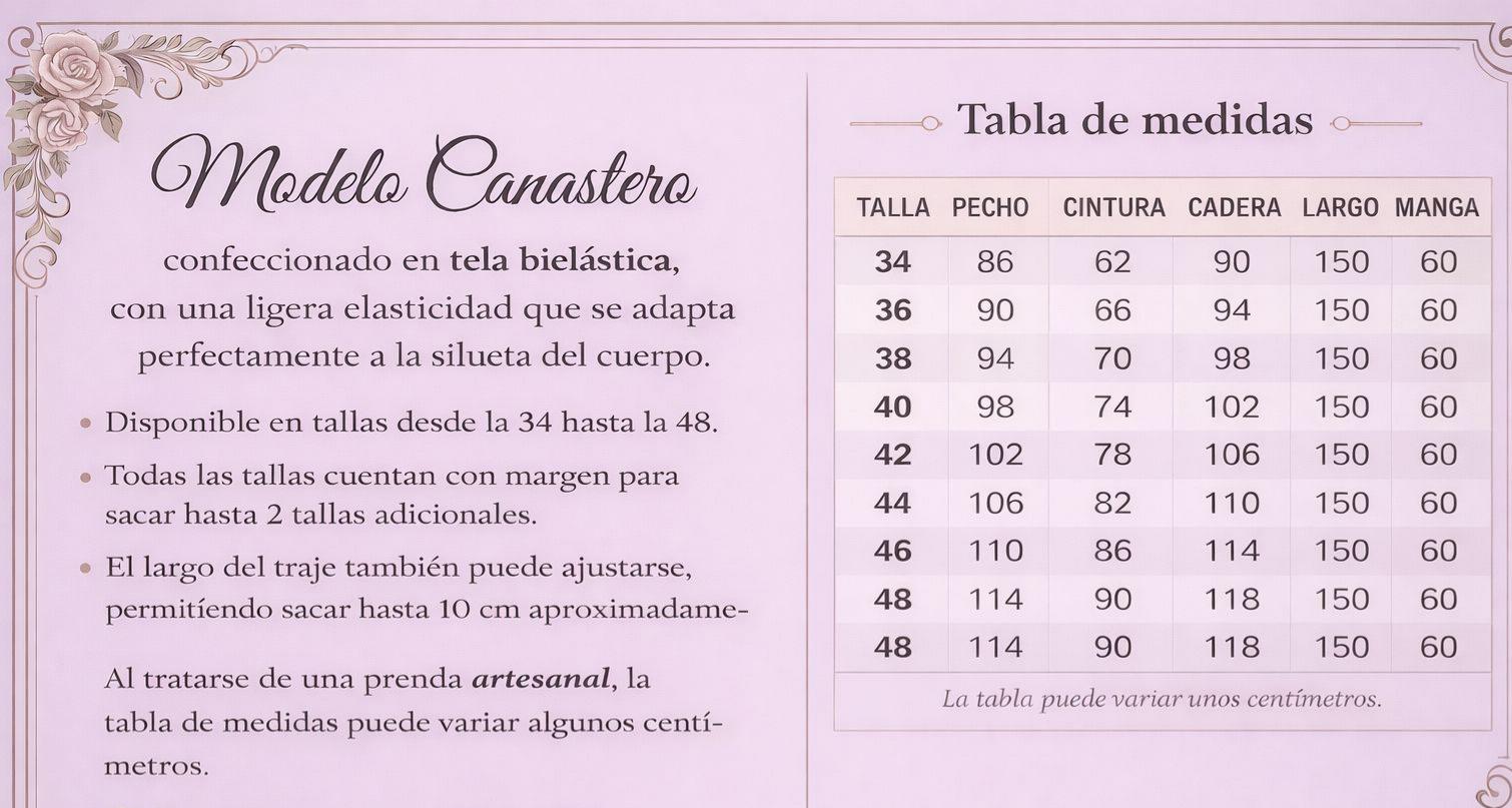 Disponible en tallas de la 34 a la 48, con opción de ampliar dos tallas más, es un traje pensado para sentirte cómoda, elegante y segura, y verte radiante en la feria.