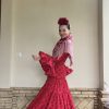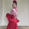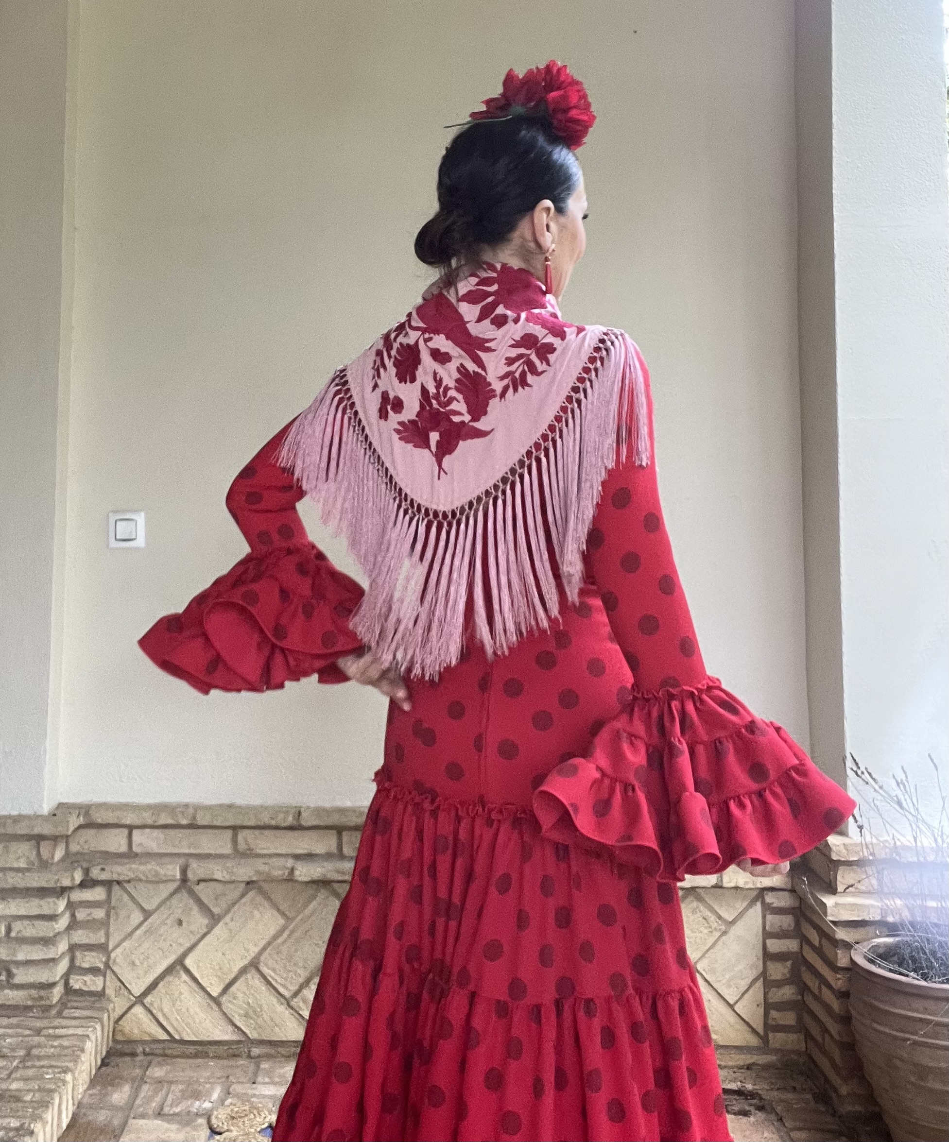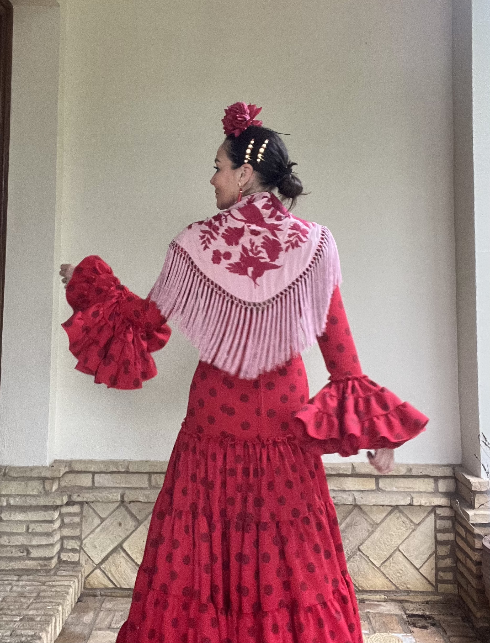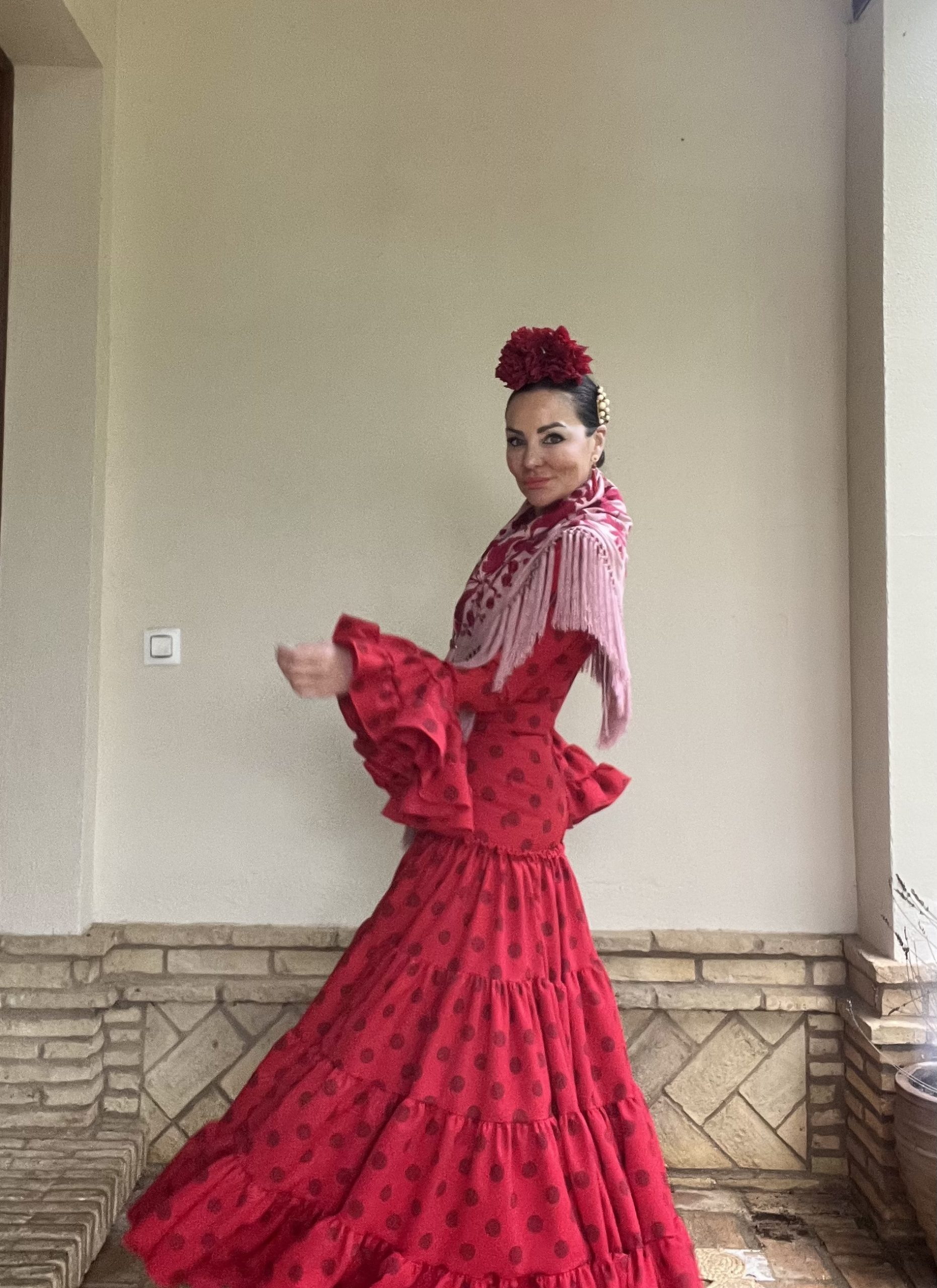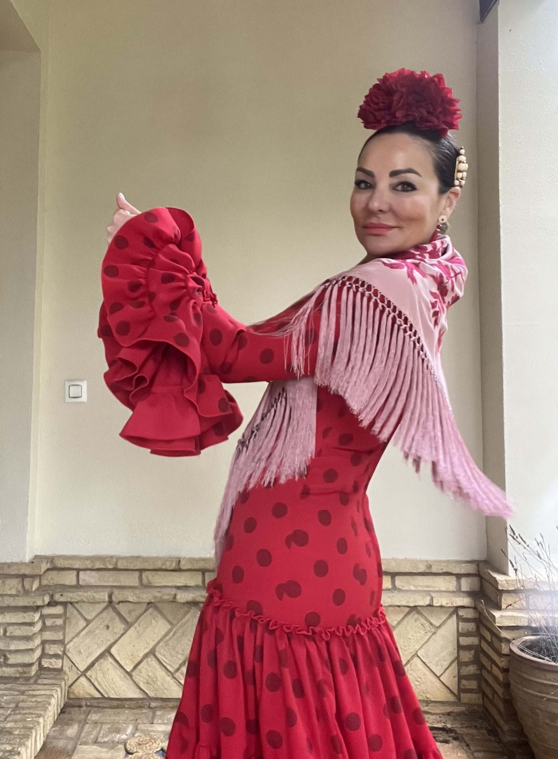 Traje de flamenca canastero de talle alto, fabricado en Sevilla, diseñado para adaptarse al cuerpo como un guante y favorecer a todas las mujeres. Su tejido bielástico proporciona un ajuste cómodo y estilizado, realzando la figura de forma natural.