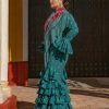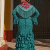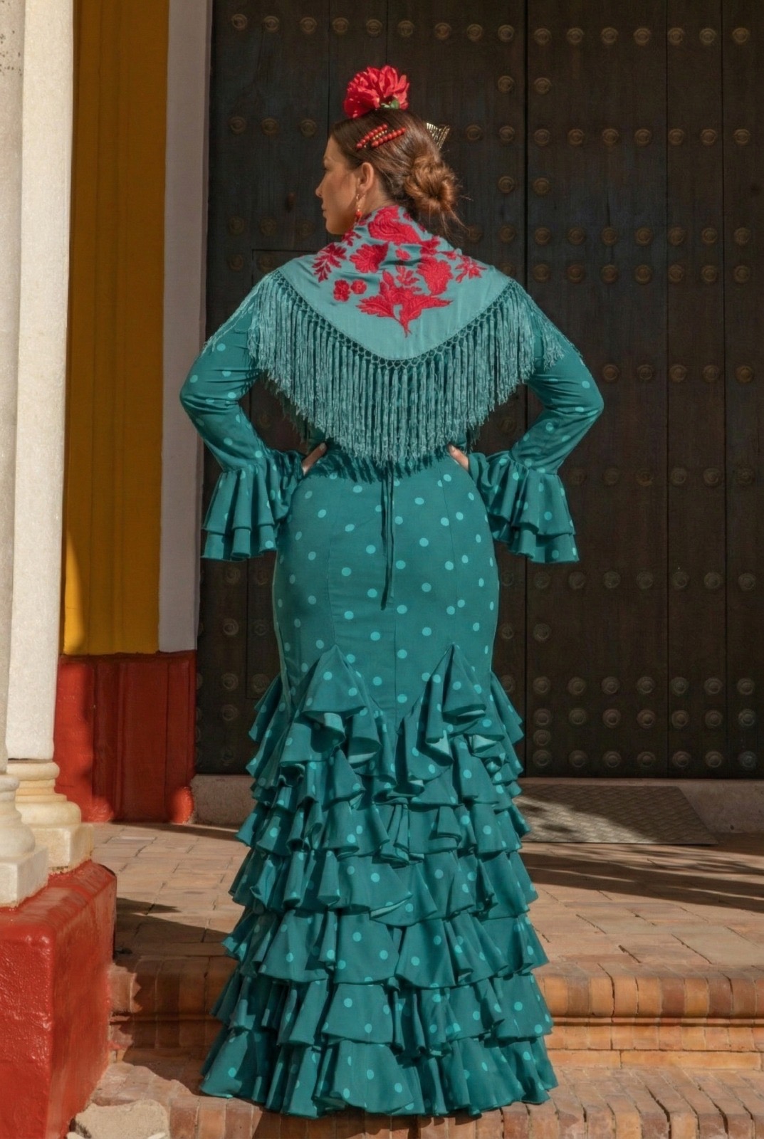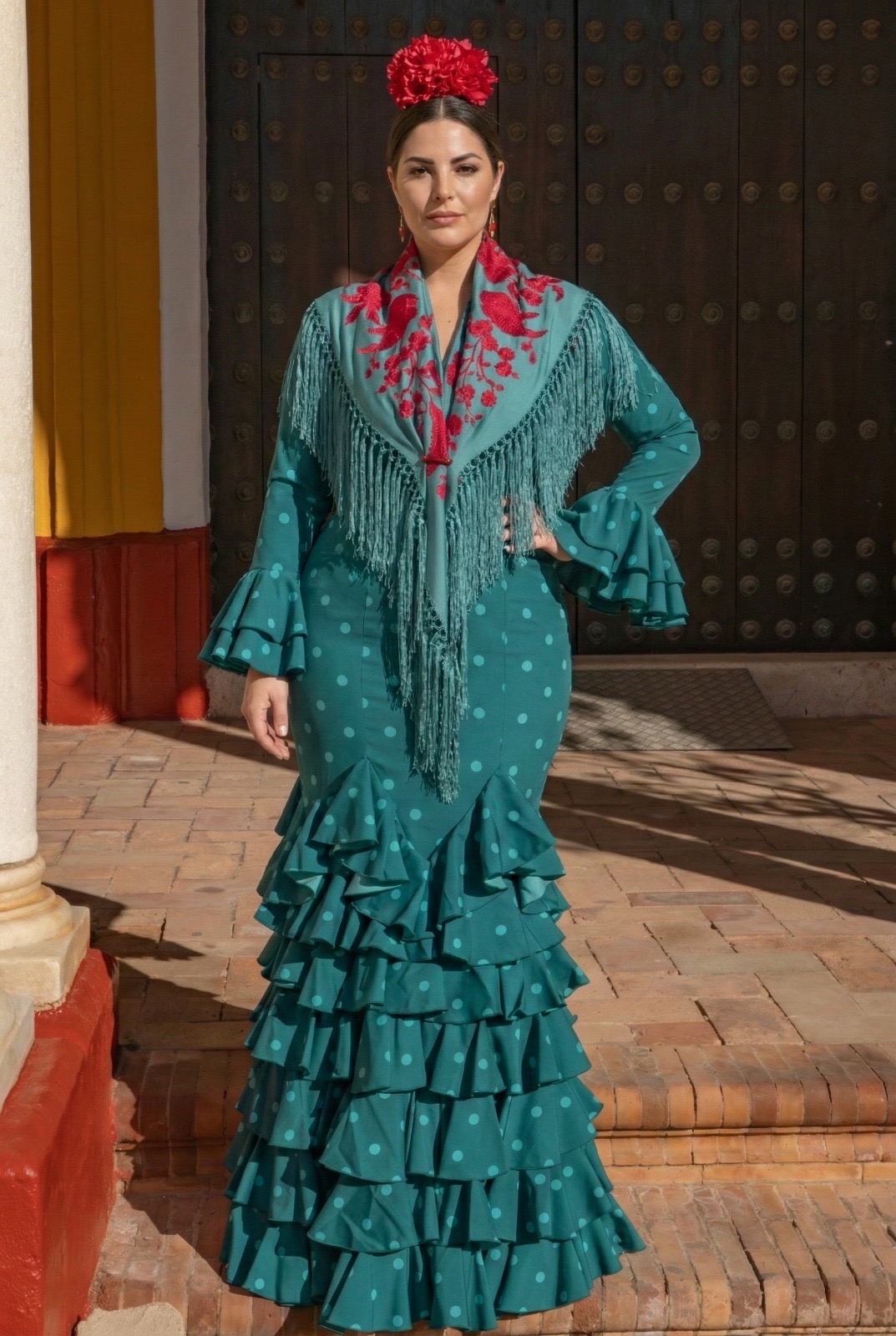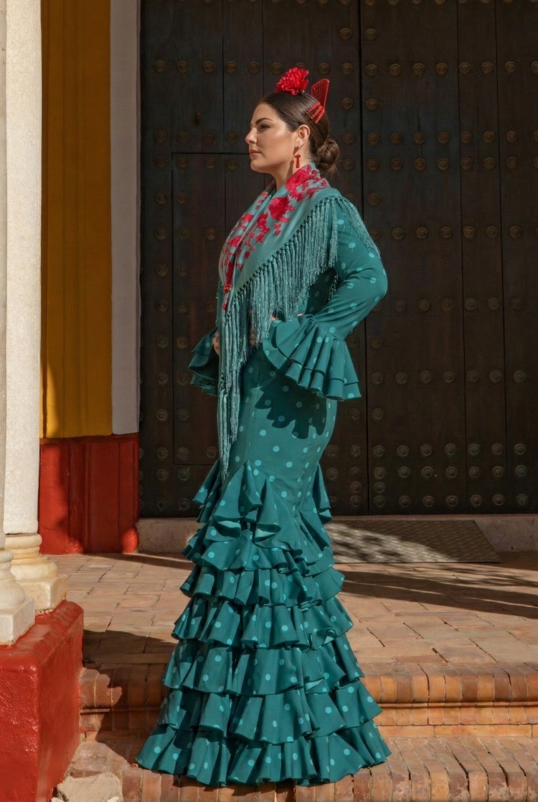 Confeccionado artesanalmente en nuestro taller de Sevilla, este traje combina el porte de los volantes clásicos con un color que transmite seguridad, calma y una elegancia imponente.