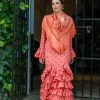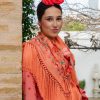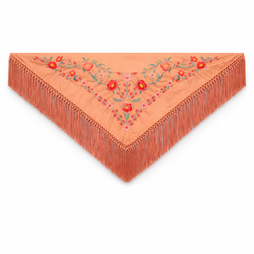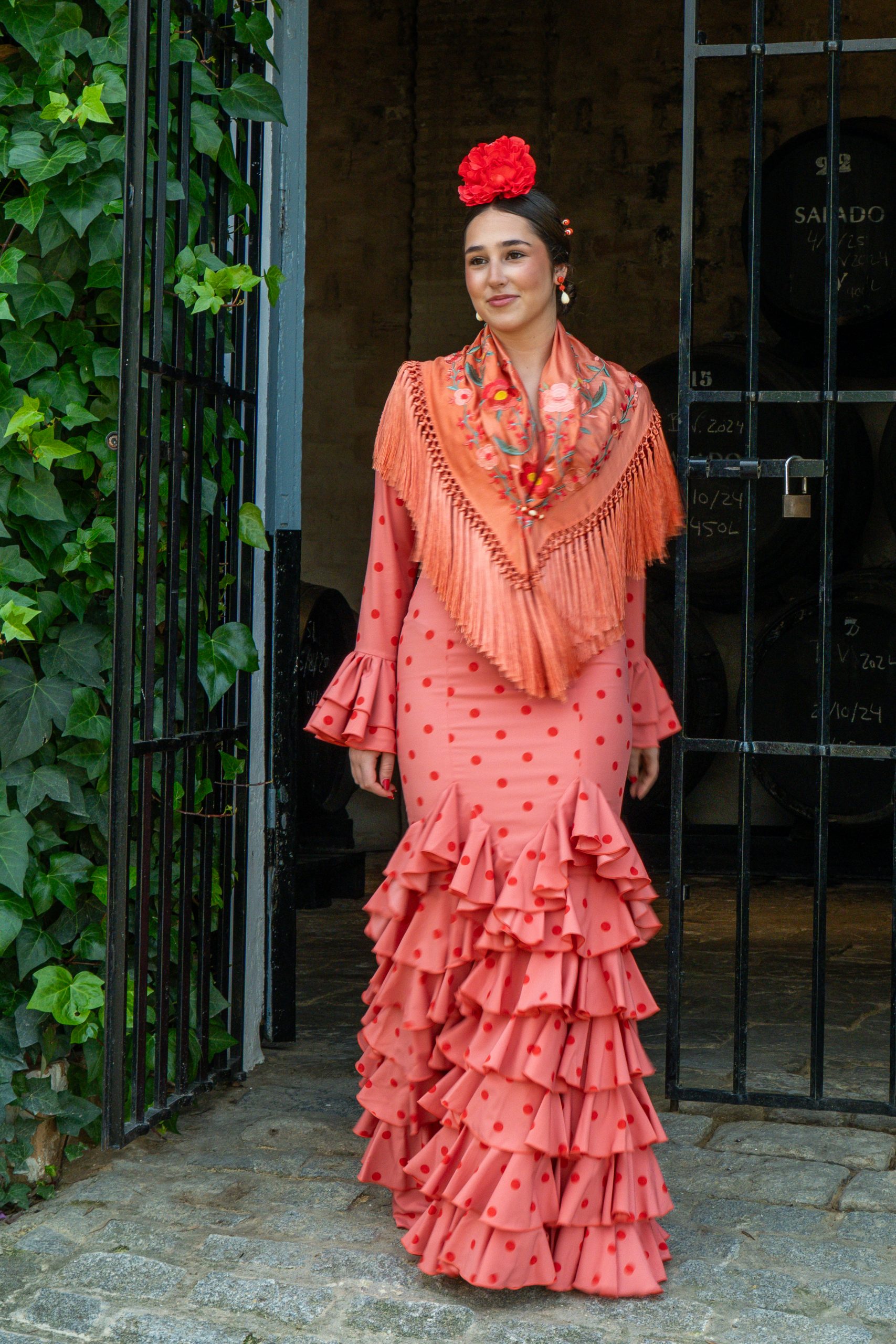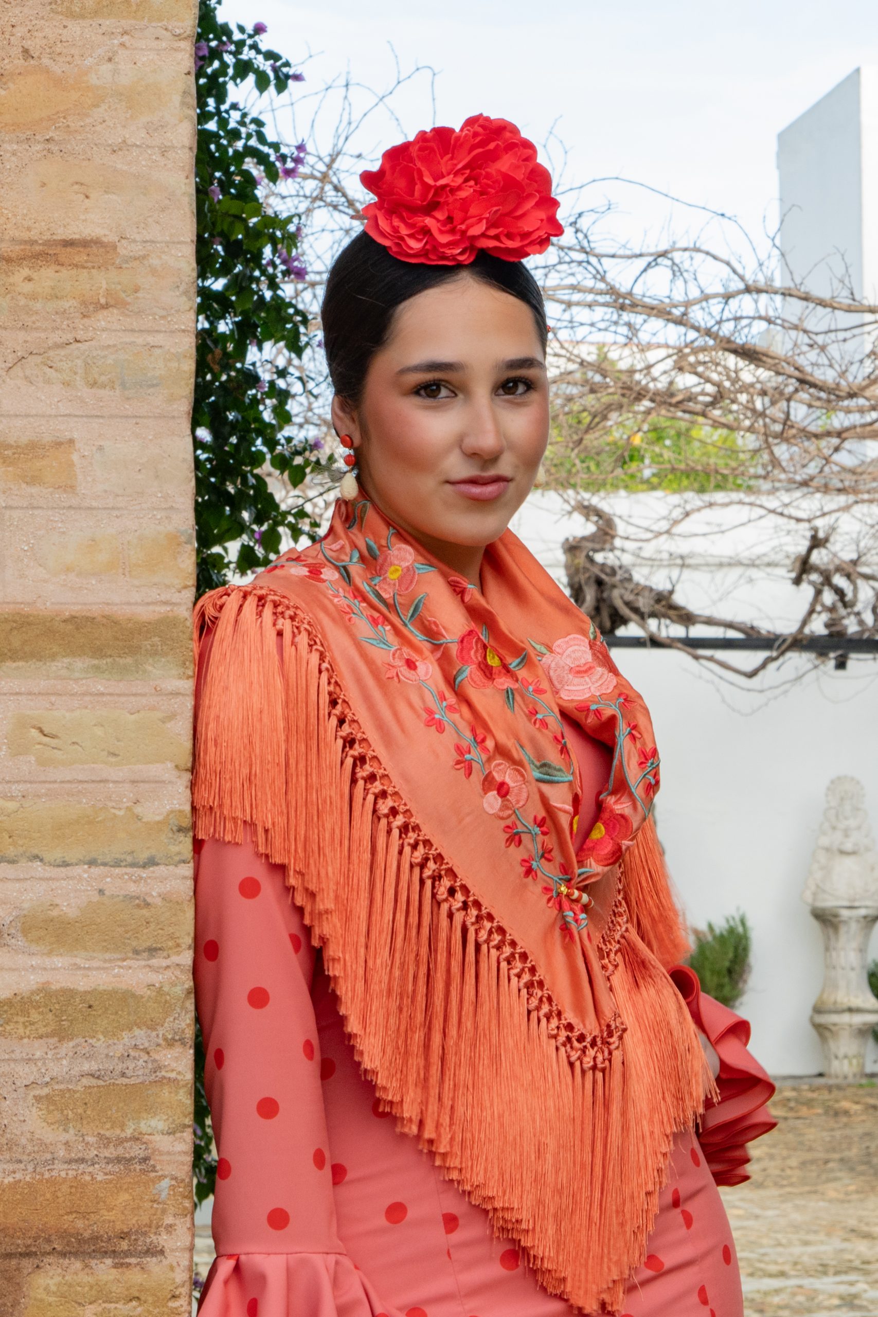 Su vibrante tono coral y sus bordados con toques de rojos, rosas y verdes lo hacen ideal para combinar con trajes de flamenca en gamas neutras como el blanco o el negro, pero también deslumbra con lunares y estampados florales. Aportará un contrapunto sofisticado a cualquier estilismo.