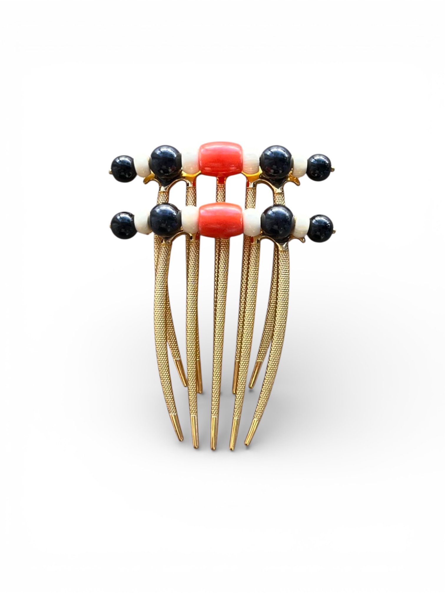 Peina Garza artesanal en combinación coral y negro con detalles en tono hueso sobre estructura metálica dorada.