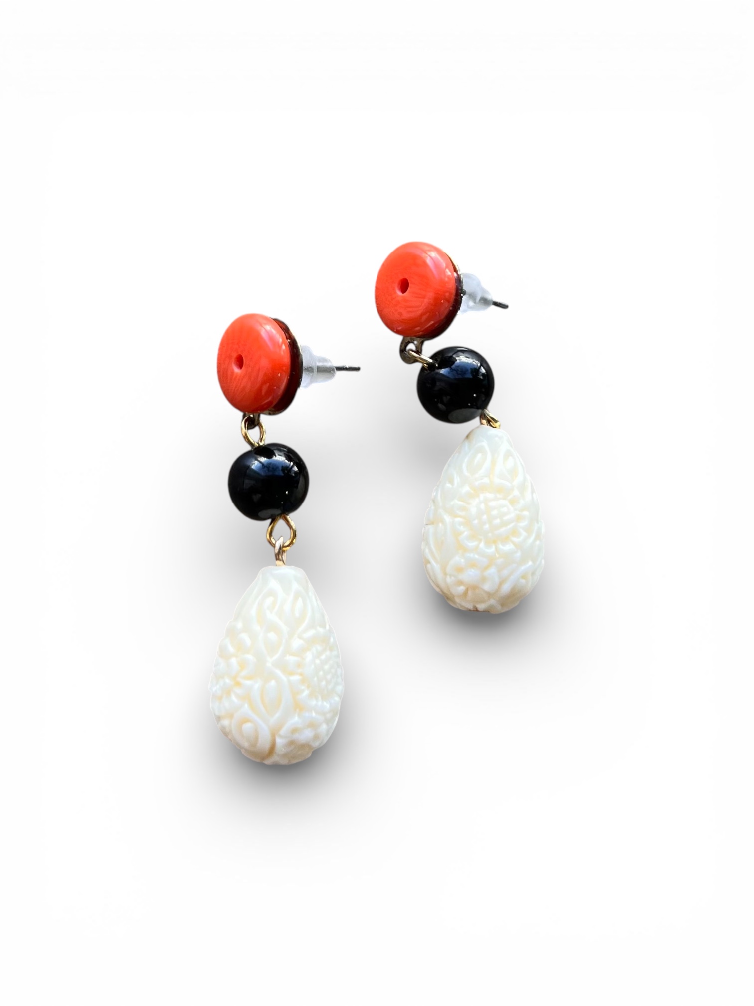 La combinación de coral, negro y lágrima tallada en tono hueso crea un equilibrio perfecto entre fuerza y sofisticación. Iluminan el rostro, estilizan y combinan fácilmente con cualquier traje flamenco.