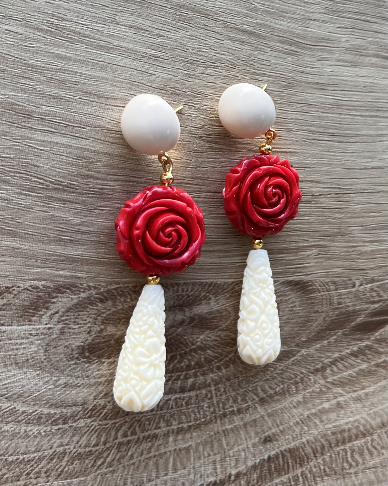 Estos pendientes combinan una rosa roja tallada con lágrima en tono hueso, creando un contraste espectacular que aporta luz, carácter y sofisticación a cualquier traje flamenco.