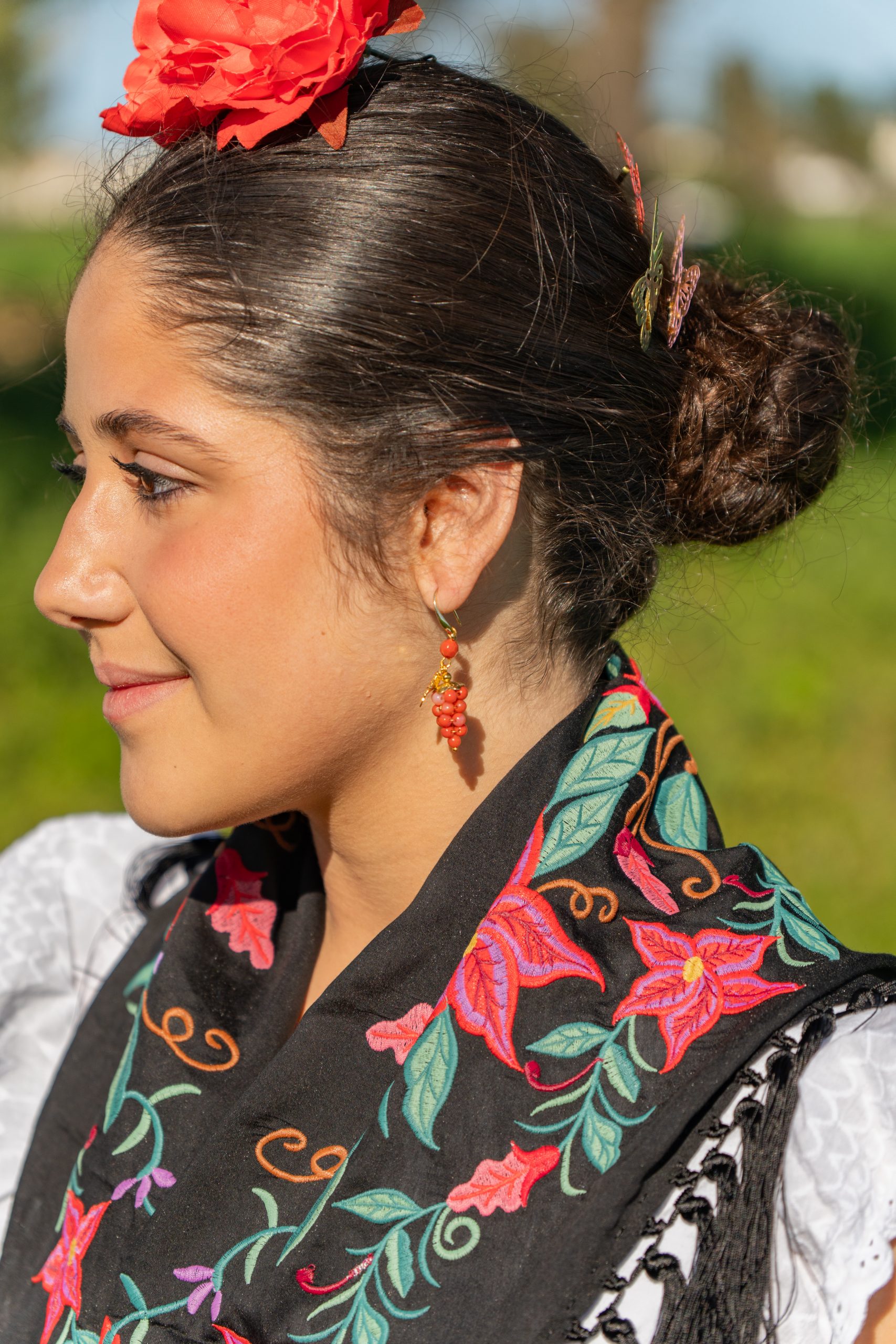 Estos pendientes no son solo un complemento; son una extensión de tu alegría, del jaleo y la pasión andaluza. Suavemente ligeros, apenas notarás su presencia, solo el delicado repiqueteo de sus pequeñas uvas mientras bailas una sevillana o brindas con los tuyos en la caseta. Evocan la sensualidad de la tierra, el dulzor de la fruta madura, la vitalidad de la primavera sevillana. Los colores, intensos y vibrantes, hablan de fortaleza y pasión, transformando tu presencia en un eco visual de la propia feria.