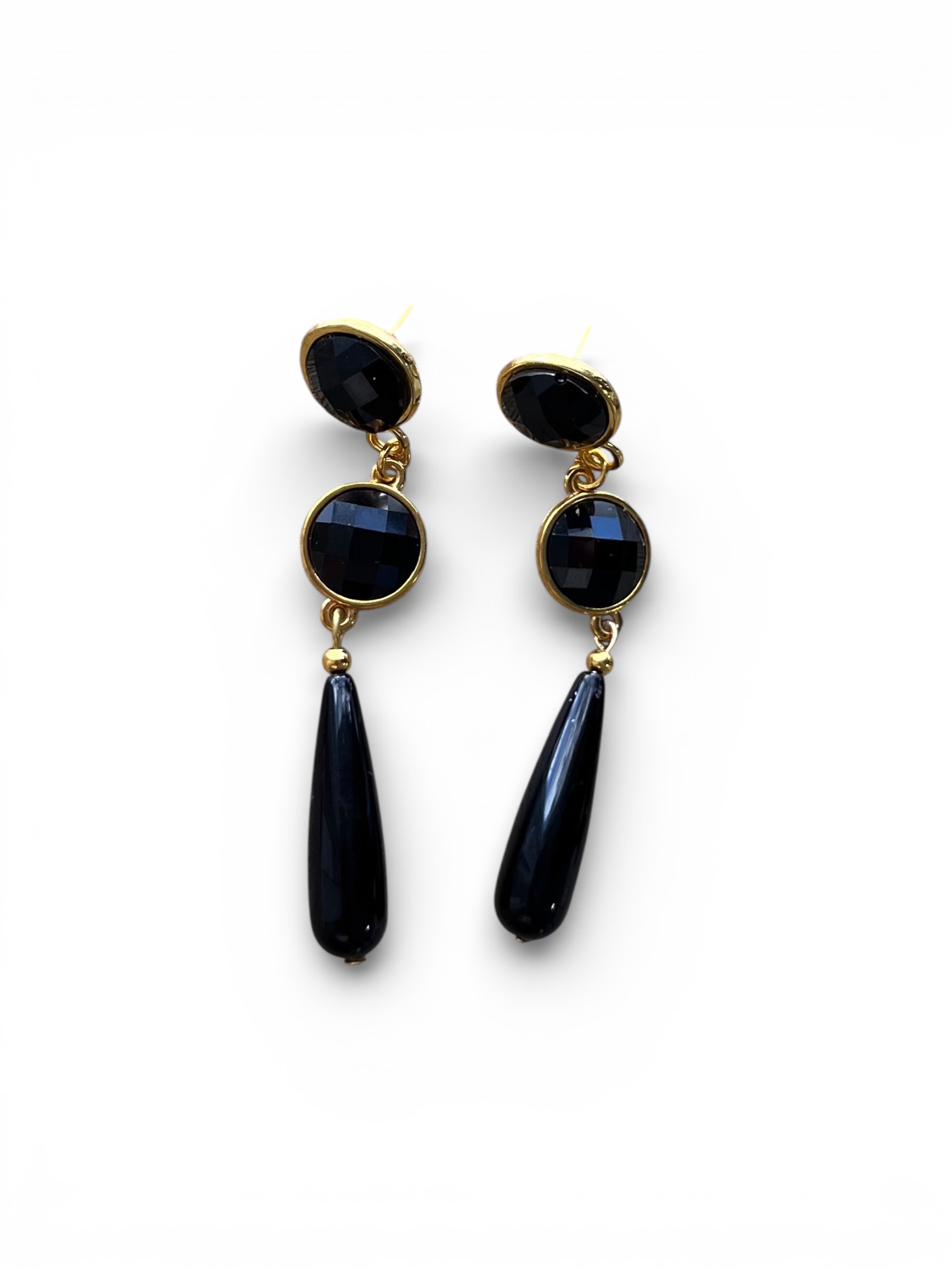 Un diseño en negro profundo con detalles facetados que captan la luz de forma sutil y sofisticada. La lágrima alargada estiliza el cuello y aporta ese toque fino que transforma cualquier look.