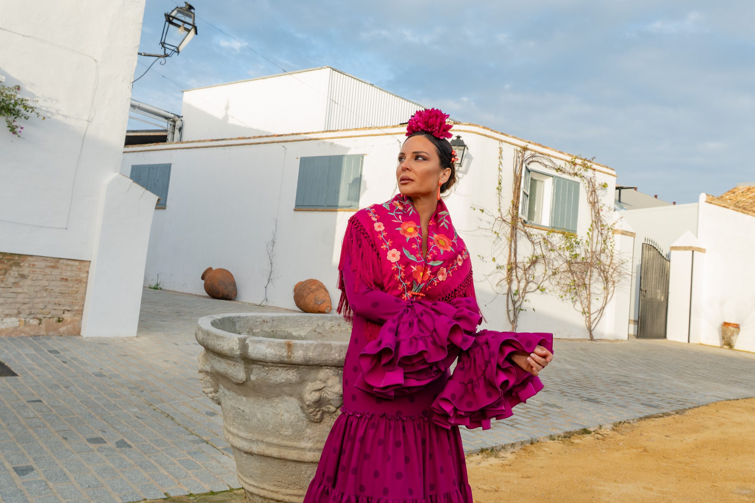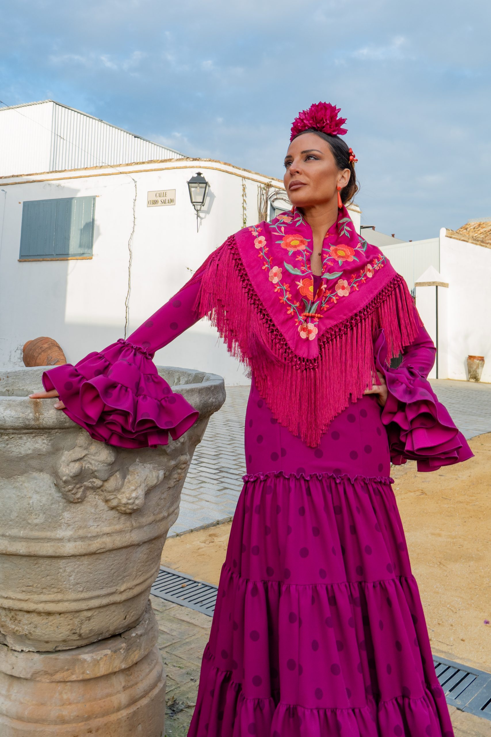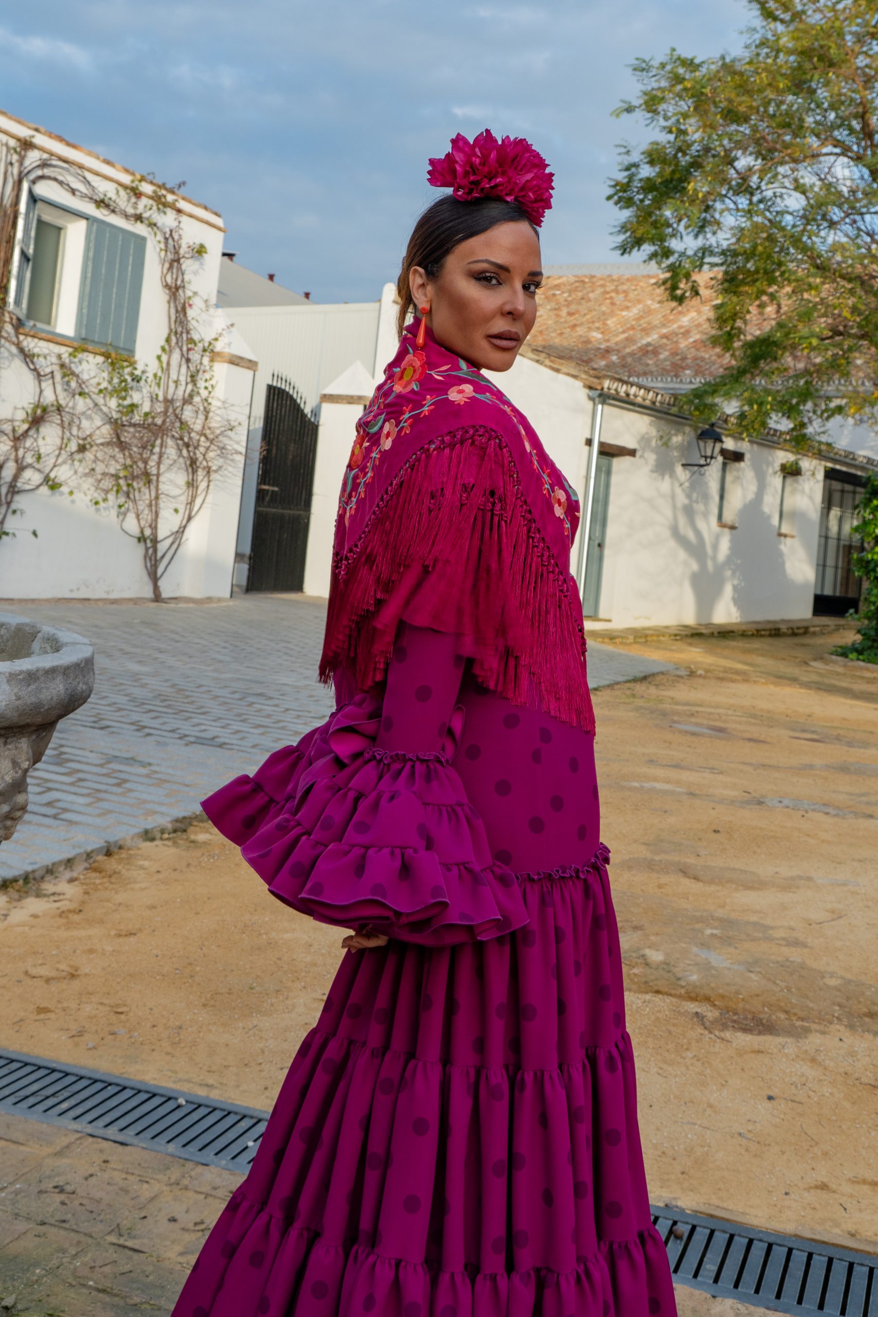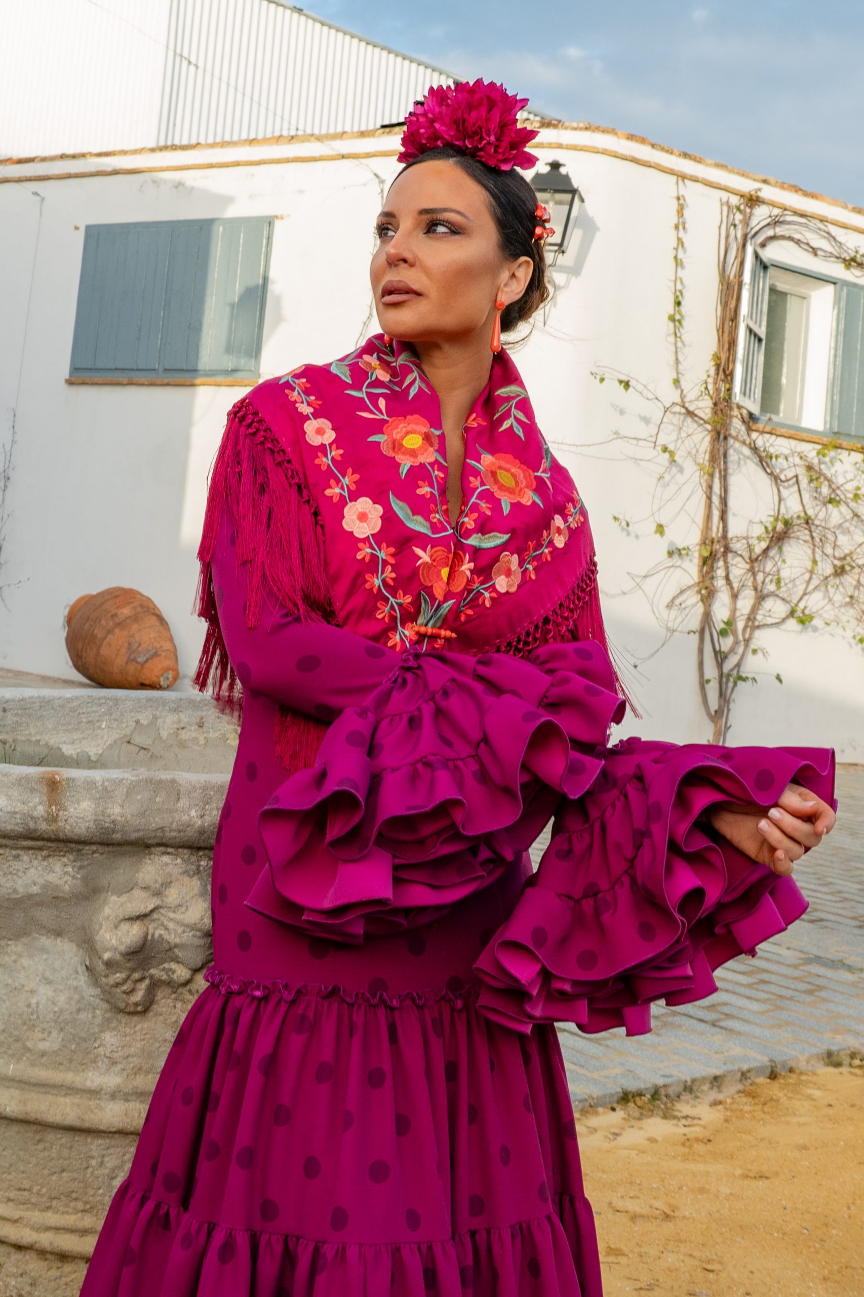 Total Look Flamenca Cayetana Buganvilla – Vestido Canastero + Mantón Estrella Rectangular + Complementos Coral