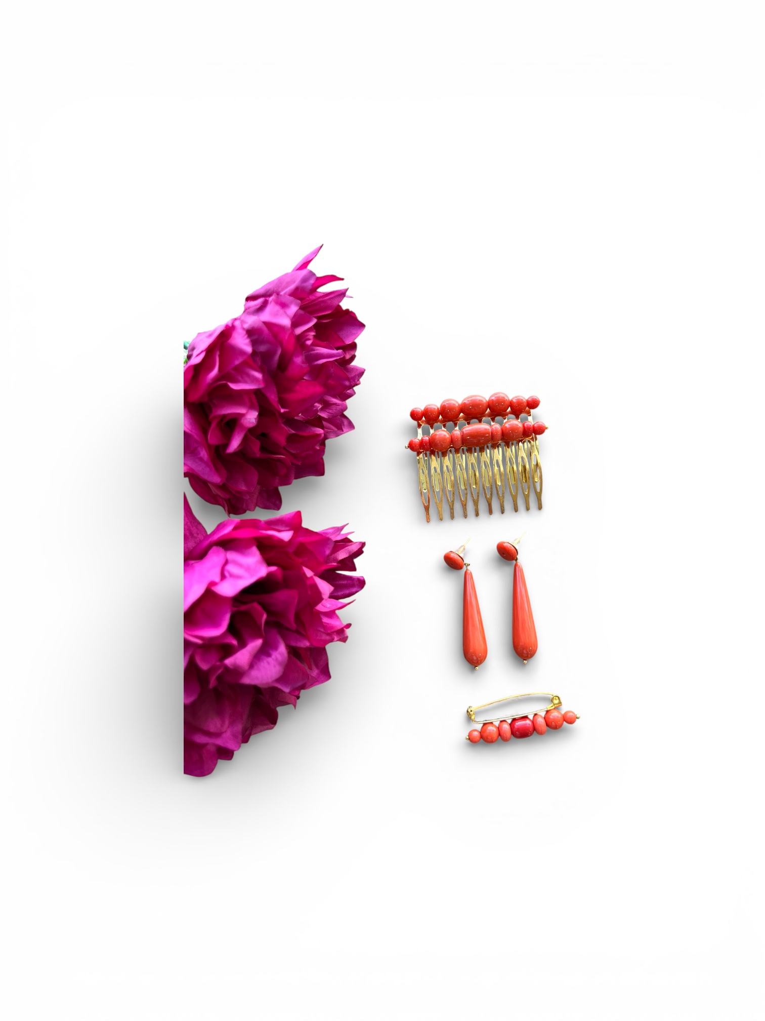 Broche artesanal en coral ideal para fijar el mantón y completar el conjunto con un acabado cuidado y coherente.