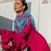 El Total Look Flamenca Cayetana Lila con Lunar es una apuesta segura para quien busca un traje especial, luminoso y diferente en feria. El lila estiliza, suaviza y aporta distinción, mientras que el mantón bordado introduce contraste y riqueza visual.