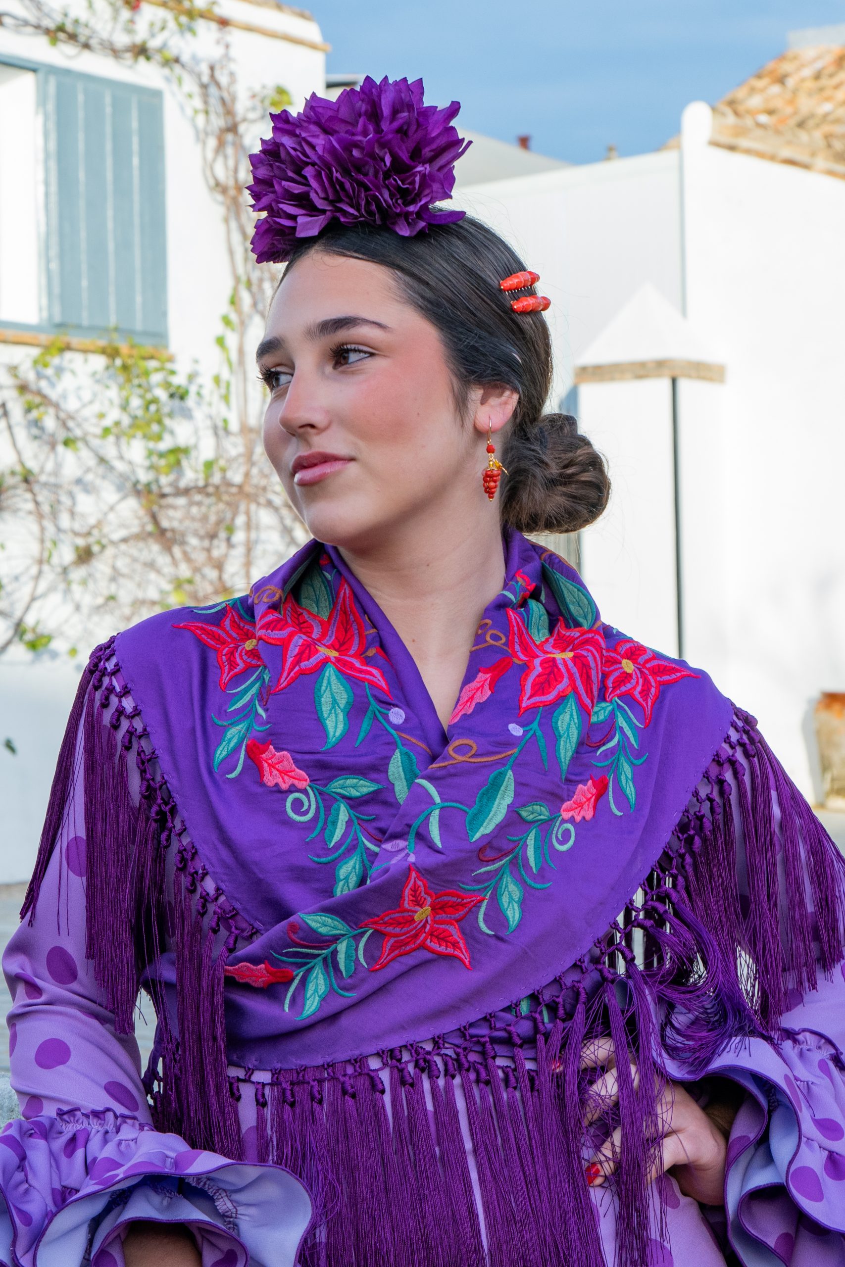 El mantón en tono morado intenso está bordado con flores rojas y hojas verdes, creando un contraste vibrante y elegante.