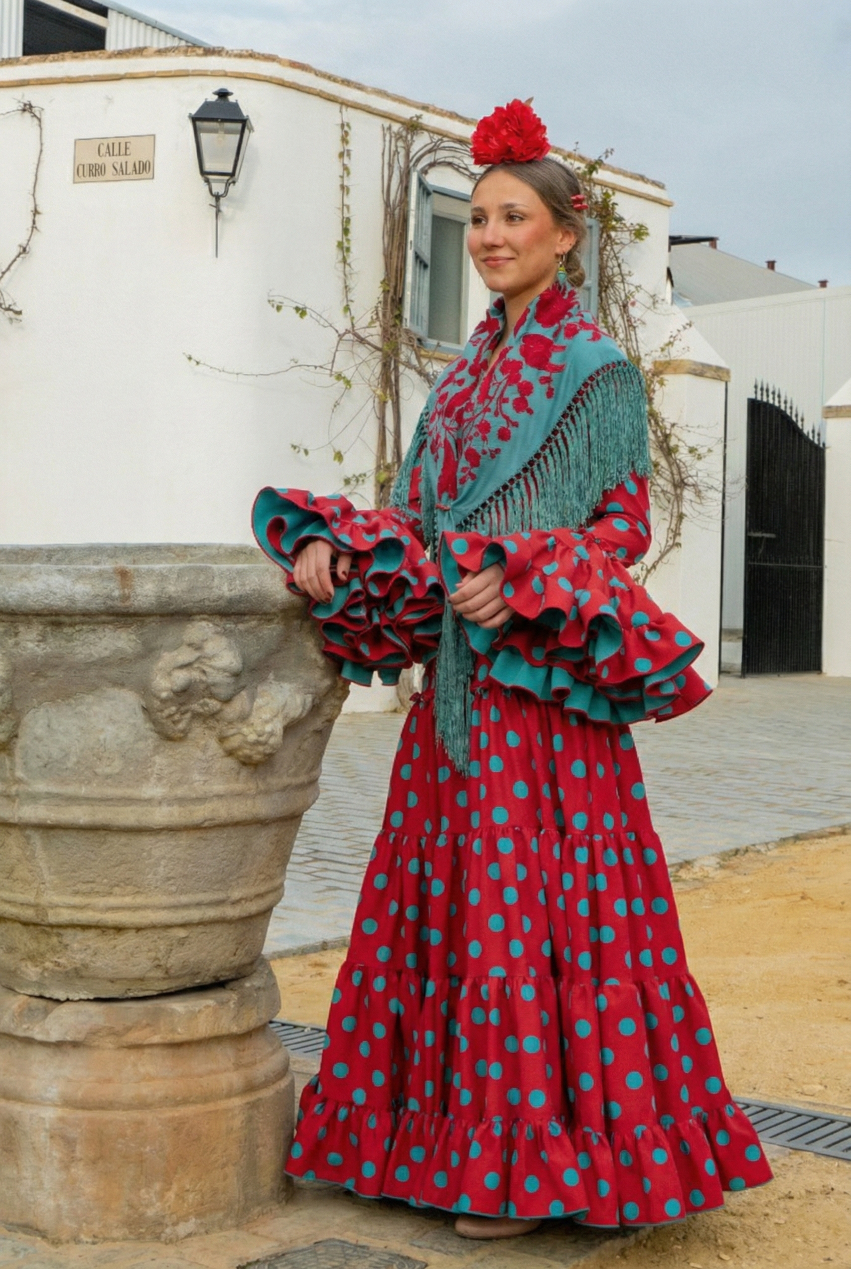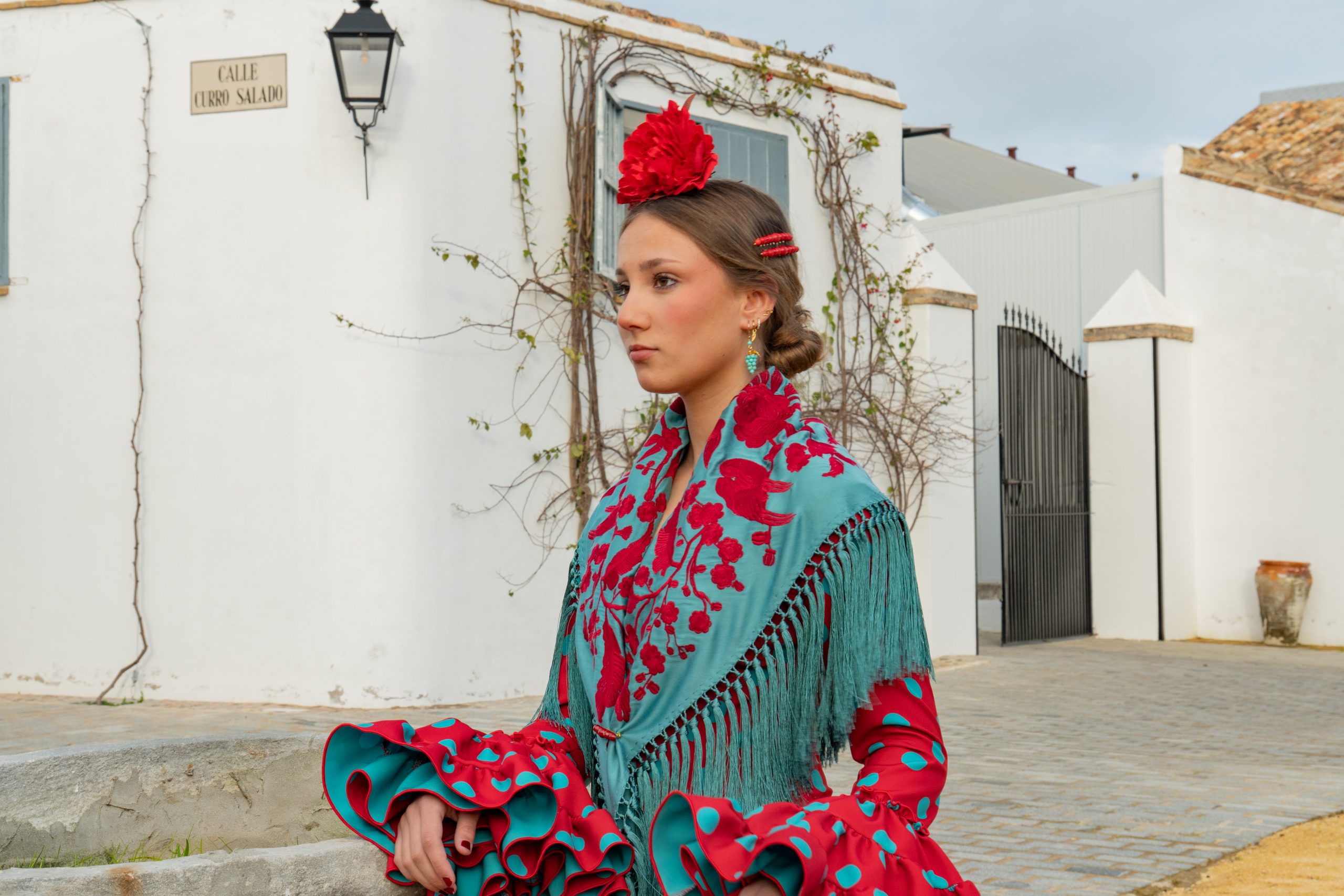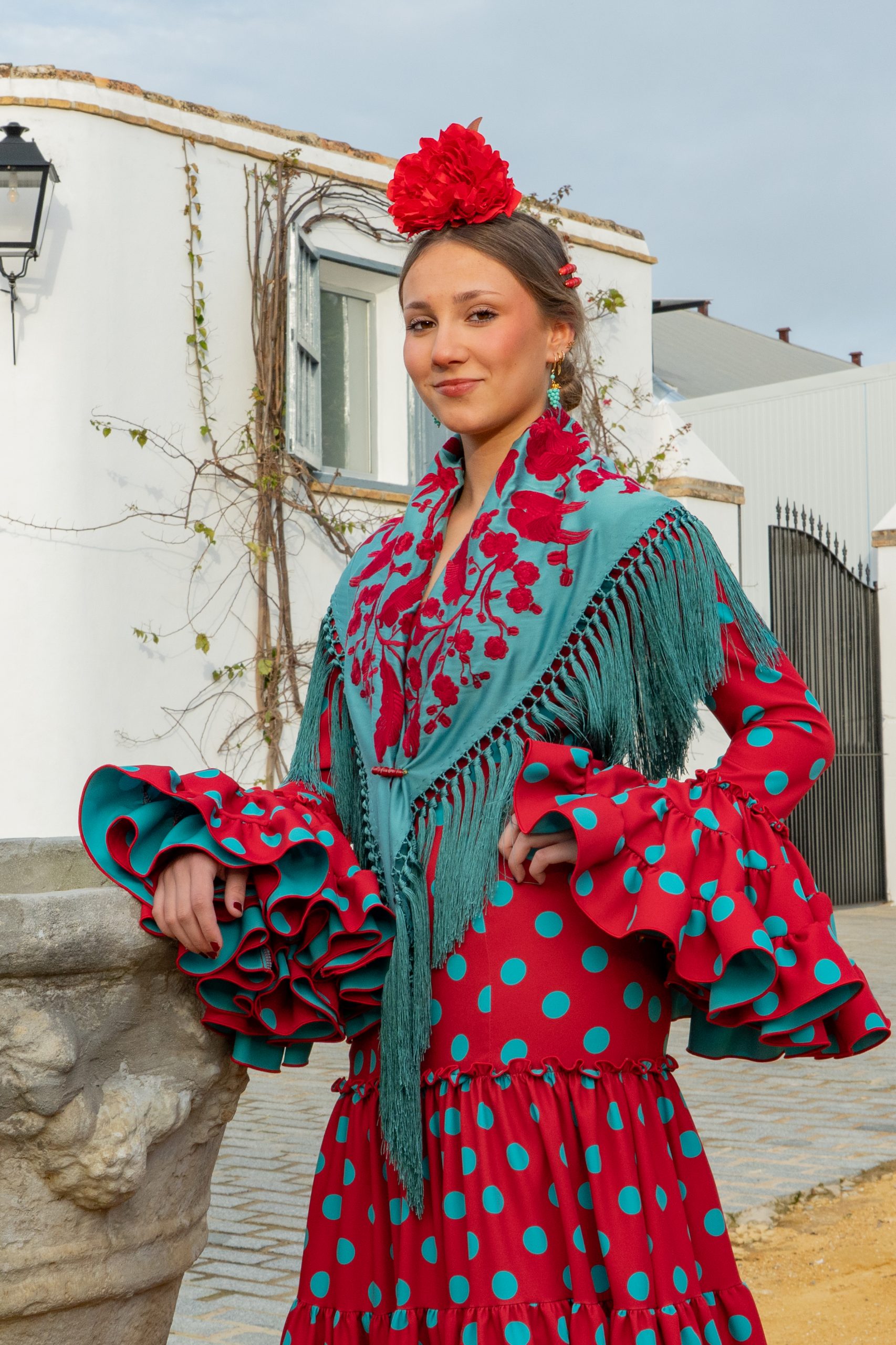 El mantón Sevilla en aguamarina con bordado rojo es la pieza que eleva el conjunto y crea el contraste perfecto con el vestido.