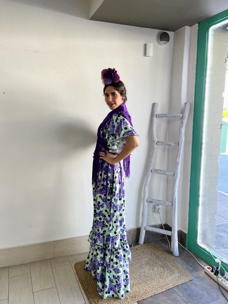 ¿Con qué colores de complementos y de mantones combina mejor? El vibrante verde jaboneta, los lunares negros y los ramilletes violetas de este diseño ofrecen un sinfín de posibilidades. Opta por complementos en tonos morados, fucsias o incluso amarillos para un contraste atrevido que capture todas las miradas. Mantones negros, blancos o en tonos ciruela serán siempre una apuesta segura para complementar su elegancia. Busca a juego un clavel o una flor que espolvoree tu pelo con esa seguridad que emana Andalucía.